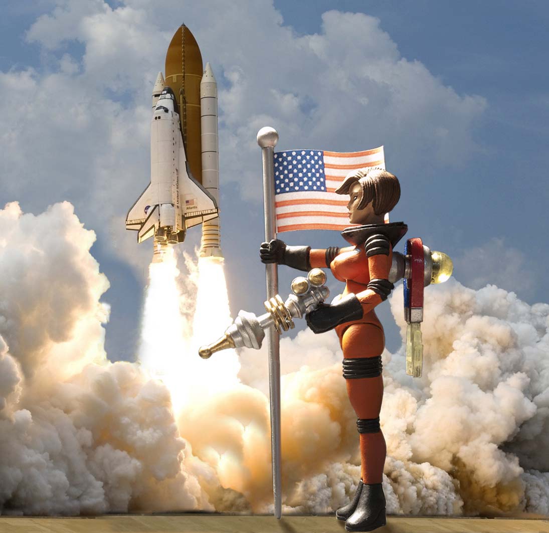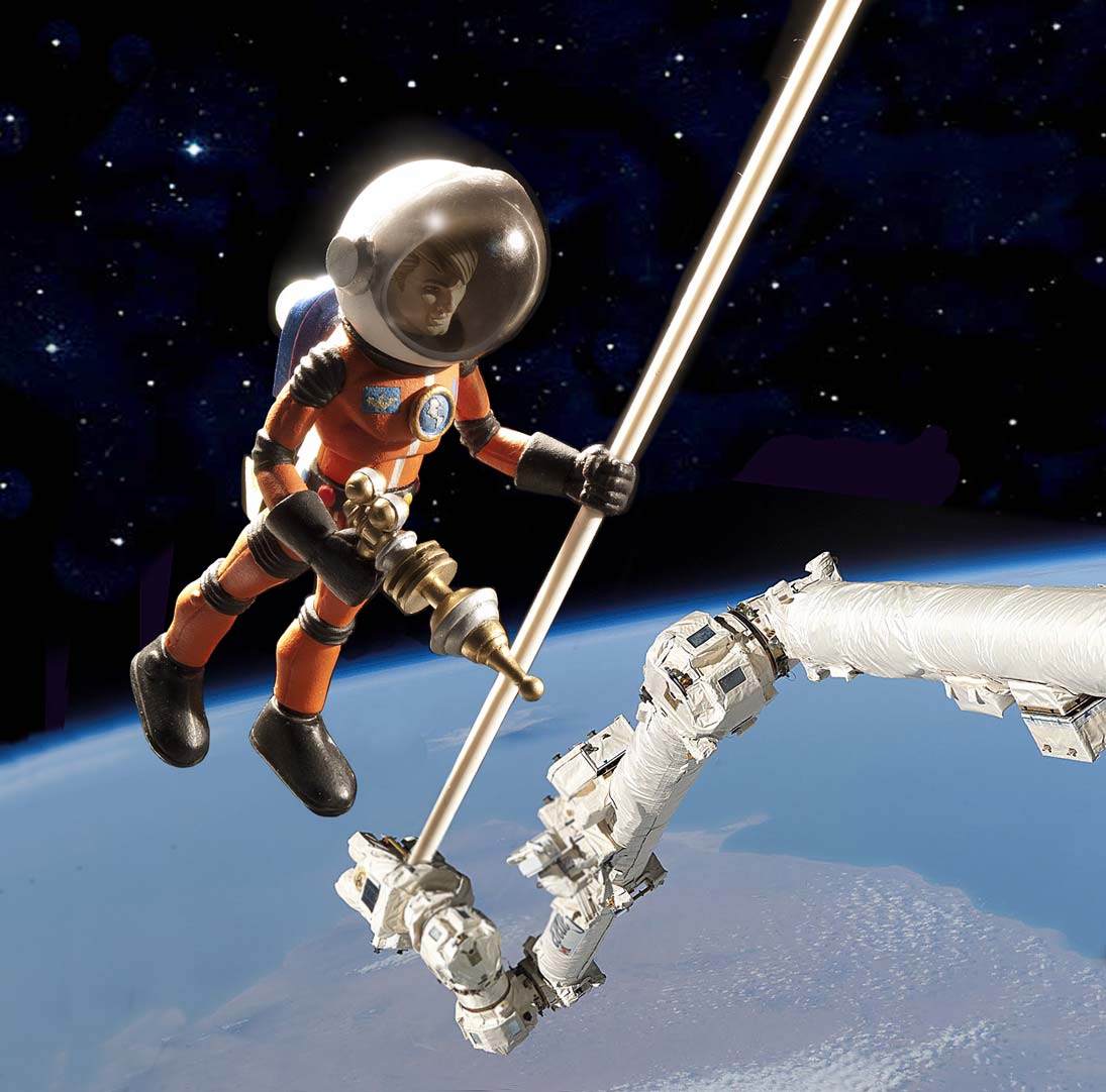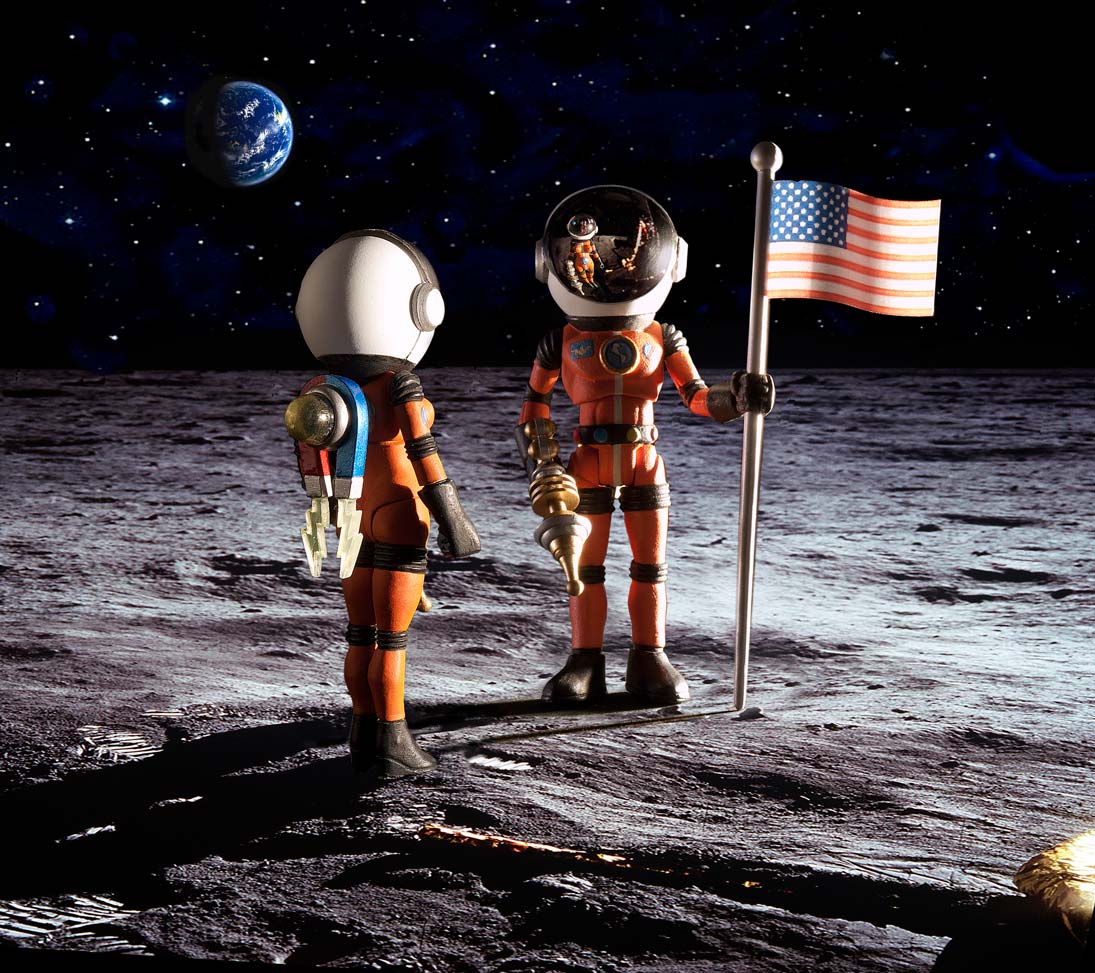 But the rest are of both Jack and Terra together. I made one each with Jack and Terra as the central figure on the moon with flag. With the reflection of the other in their helmet. Of course, the second figure is where the magic comes in, It shows the Anti-gravity device, too good to waste hidden behind, and also, in one case, demonstrates how it operates. Last is simply a flight of fancy. By this time I was getting carried away.