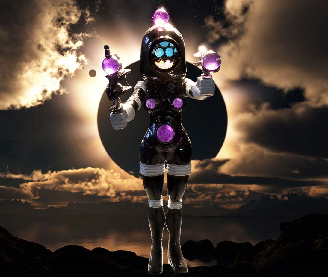 Most important! The whole thing should be in transparent clear as was her male counterpart Metamorpho. If you want to mold everything in that great purple color Matt uses, all except the head and helmet that would be even better, but the HEAD and HELMET must be clear and colorless, so that,means you have to do what I did and begin by spraying purple on her chest and back! I also sprayed the balls on the weapons purple, and the tummy button too.