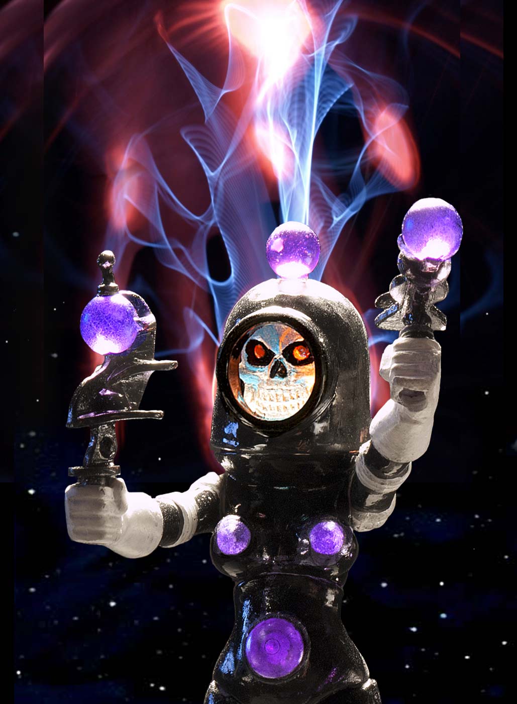 Now the head. I could see from the body that what I had in mind was not going to be effective, so I went to plan B. What a leap! Leaving the scull unpainted altogether, except for some black in the nose and eye sockets, and transparent red on the eyes. The effect when the light comes in is pretty amazing! and as the head is turned the other colors keep it changing. I sure hope the head turns freely in the final as when it is rotated the real magic takes place. That colored ink I used looks lousy, Its mottled effect is not intended to be replicated. there are fantastic transparent paints in the world, just not available locally for hobbyists like me. I have to apologize for my painting. I expected my hand to let me down, but it didn’t. The problem was my eyes. I, flat out, couldn’t see, even wearing 3 pairs of glasses. I also didn’t have the proper transparent paint and had to use India ink. But what I did conveys the intent. Paint masks might be best made using a piece cast in a solid color as the guide. The transparency made it impossible to see.