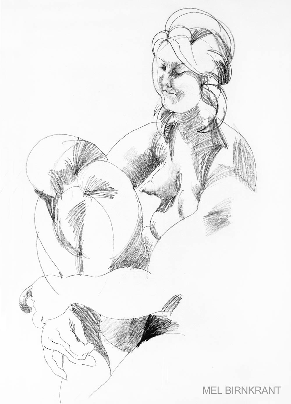 The drawing on the lower right, I find infinitely more satisfying. I ultimately gravitate towards exaggeration. Here, I over emphasized in the opposite direction. Quick and direct, I like to see it contrasted to this almost caricature of a lady on the left, who was more weighty. These two drawings always seemed like a pair, to me.
