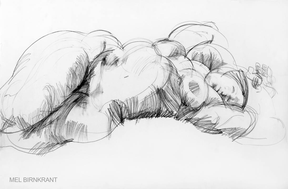 Of all the drawings I found recently, I believe the sketch below is my favorite. Even though, it is enthusiastically messy, the languishing voluptuousness of the reclining figure shines through. Paging through the hundreds of drawings I found in those two boxes, I had eliminated this one, early on. Lying flat on the bell tower bed where I sorted the drawings, it looked like a total mess. In the end, it was the one that I reluctantly chose last. Ironically, when seen upright, through the camera’s eye, it turned out to be the one that I liked best.
