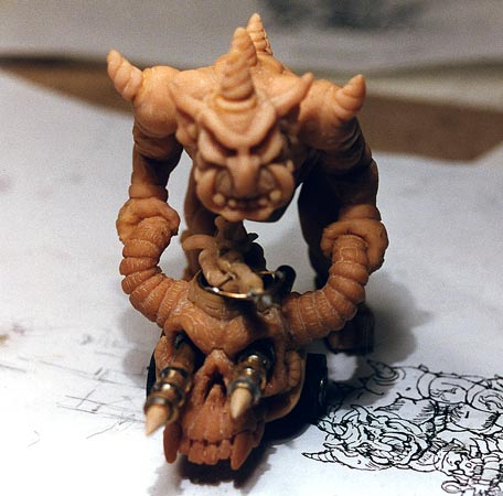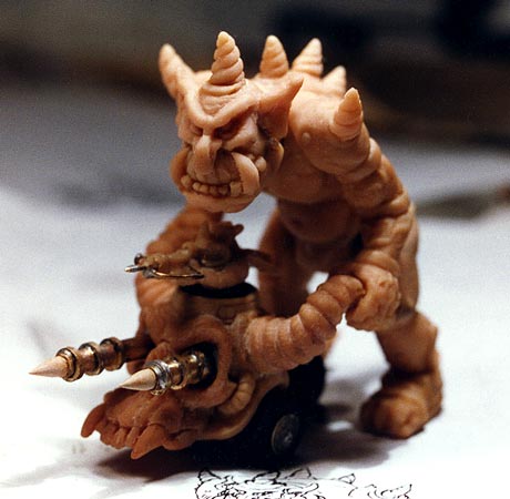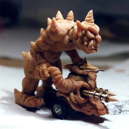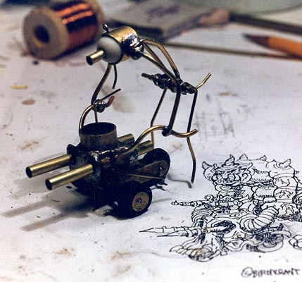 Just as with Tiny Tots, I proceeded to make a series of drawings and one working model. These photos show the process, beginning with a makeshift armature, to which I added Super Sculpey. Like Tiny Tots, the resulting action figure was rather small, but large in concept, and fully animated. With just a nudge from one human finger, the Mighty Ogre walks along, pushing a mobile battle unit fashioned from a giant skull. With each stride, his fearsome head turns, from side to side. The battering rams move in and out, and in the turret, a tiny rhinoceros-like Knight, wielding a crossbow, rotates, round and round.