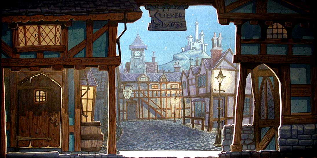 But more was needed. I realized that much of my early artwork would, actually, work against me. Seeing it anew, I didn’t dare include it. Therefore, one project that I undertook, for the occasion, was to render one of the sets I had designed for the Thirteen Clocks, in miniature, like a scene in a toy theater. Then, I painted it in the realistic style of the backgrounds that one saw in Disney films. I tried to convey lighting effects, as if the street lights were glowing, and the entire scene was bathed in blue-white moonlight. I managed to succeed, to some degree; and I really enjoyed doing it, as attempting this level of realism was something new to me. I also engineered it to operate like a Pop-Up Book, so the stage could fold down flat to be transported in the portfolio. Then, when set upon a table, it popped right up, on its own, to stand alone.