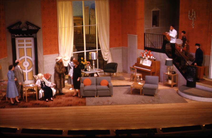 Everyone attending Mumford was required to suffer through at least one art class. This endless parade of the disinterested was punctuated occasionally by a few rare young ladies, who had a knack for drawing horses, usually, on the margins of their textbooks. That was about as good as it got, for Jim. And then along came a kid, yours truly, who eagerly elected to take every art course on the menu, and some that were invented for him. I joined the Art Club, from day one, and faithfully stayed after school to help create the scenery for every high school production, from “The Man Who Came to Dinner,” to “Pygmalion.” Mr. Siddal, designed all the scenery, and a handful of students, myself included, assisted him. The results were always impressive. Here is a scene from “You Can’t Take It With You,” as seen from Mumford’s balcony.