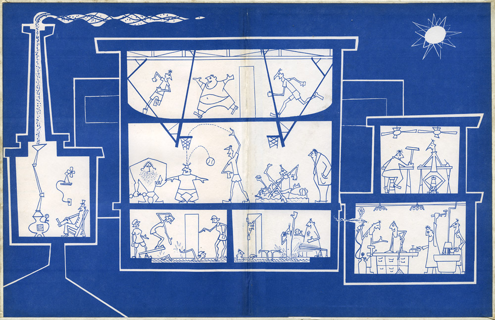 The end pages were two cut away views of the front and the back of the school. These were prime examples of the artful way I circumvented the fact that I couldn’t draw. They embodied a principle that I have intuitively embraced all my life: “Whatever you do, make it look intentional!” So I adopted a highly stylized style, reminiscent of the look one saw in UPA cartoons, or that awful Disney copy of them, “Toot, Whistle, Plunk, and Boom.”