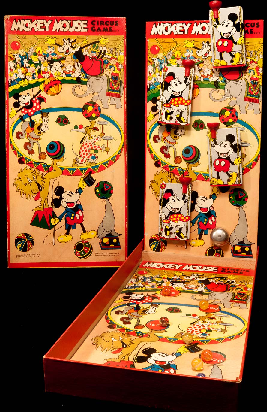 Below, are a few examples of Knock Your Socks Off Mickey Graphics, beginning with a Mickey Target that really hits the bull’s-eye! This was created by Marks Brothers, not the comedians, but the Boston toy company, in 1933.