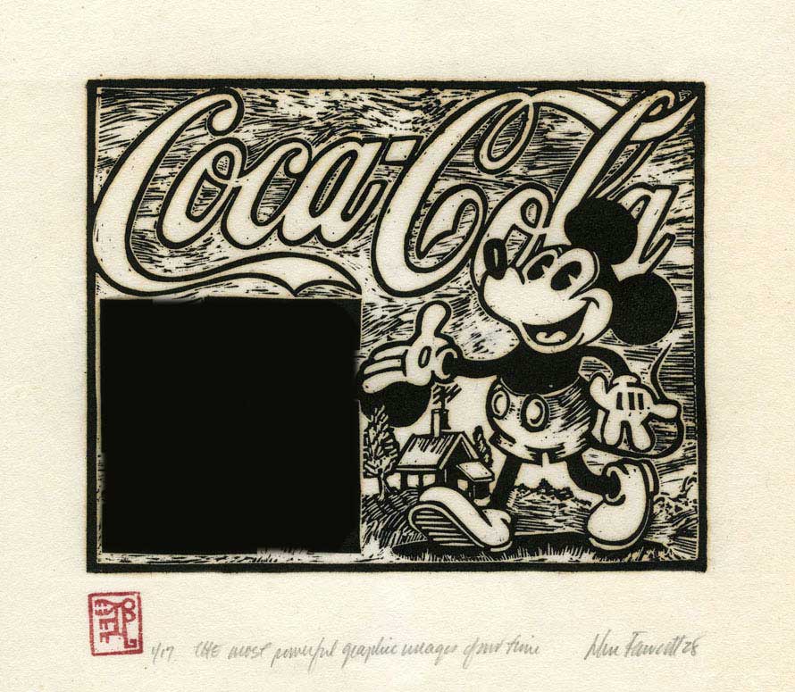 In the Life article Ernie Trova supplied a quote: “Along with the swastika and the Coca Cola bottle, Mickey Mouse is the most powerful graphic image of the 20th Century.” John celebrated Ernie’s words in a woodcut. That Christmas, he gave me a copy. I was honored to see that it was number 1 of 17.