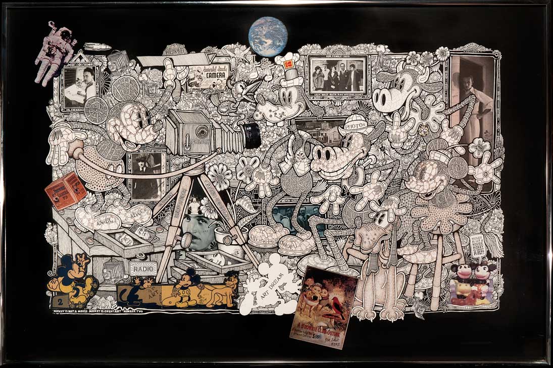 The above example of John’s art was early, and fairly simple. His later artwork grew increasingly more busy. I loved these complex and intricately woven drawings. Each one was based upon a piece of original Disney graphics, dating from the 1930s. To be utterly honest, I could never quite decide what about these was turning me on. Was it the fact that I was seeing through the surface to appreciate the original Disney image underneath, or was it the way that John embroidered and transformed that image that excited me? After all these years I still can’t make up my mind. I guess, the bottom line is that I love both versions.