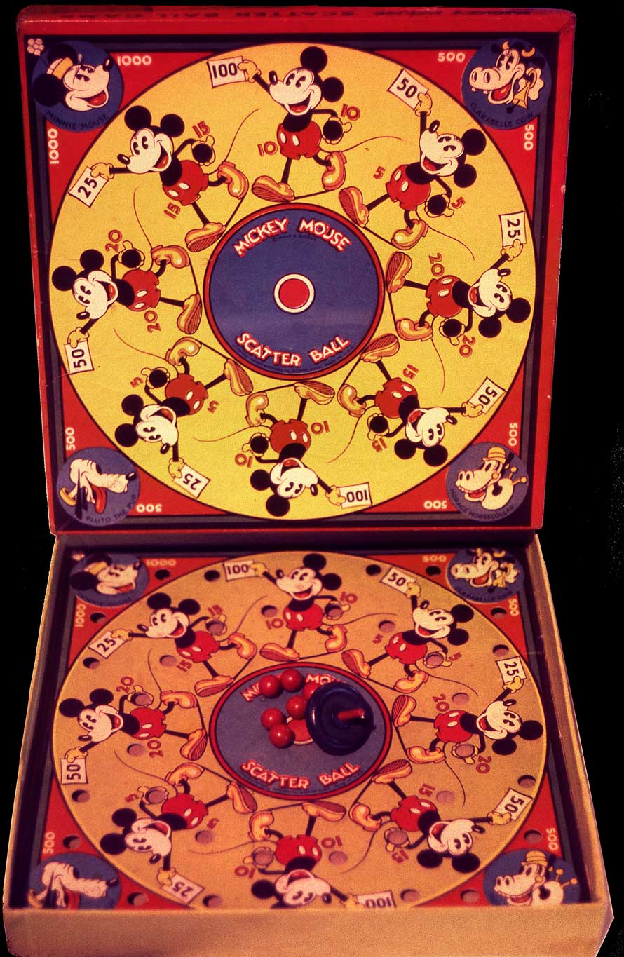And here’s a wild and crazy game, called, Scatter Ball. The repetition of Mickey’s most Iconic pose is stunningly effective. This rotating composition that forces us to view Mickey upside down, among a sea of numbers and random holes, moves gently into pure abstraction, with fascinating patterns, created by the repetition of Mickey’s swirling tails. To some, like me, it alludes to the kind of animation one finds in early optical toys such as a phenakistoscope or a zoetrope, and depending on what one brings to this, it might even evoke the majestic Rose Windows of Notre Dame Cathedral.