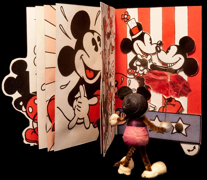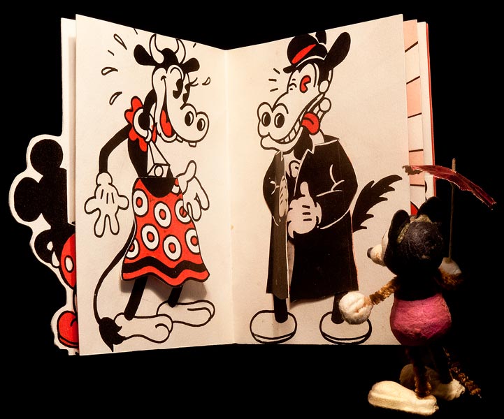 The memory of these came back to me, as I was wracking my brain trying to think of a Mickey Mouse Christmas gift that my mouse collector friends would appreciate. They represent the first and only Mickey toy I ever sculpted in 3D. Perhaps they were a little naughty. I sculpted them in wax and then cast nine copies in epoxy. I kept one set of each: red, white, and black, for myself, and gave the other six sets away. The recipients were: Richard Merkin, Kenny Kneitel, Al Horen, John Fawcett, Maurice Sendak, and Harry Kislevitz.