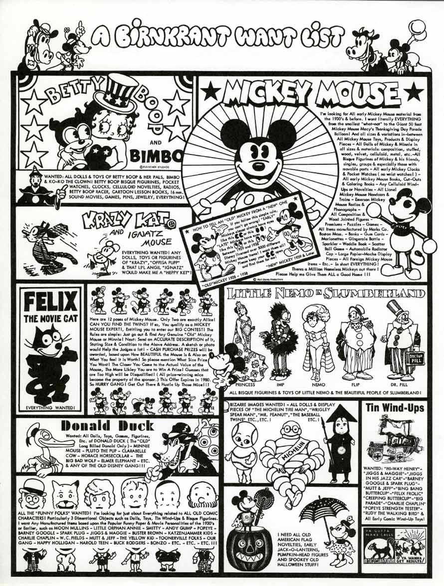 To implement our quest, we devised a secret weapon. This consisted of: Want Lists. These documents became the stationary, on which we answered every offer we were sent, or passed out to dealers who might be inclined to find good things. They were a kind of guide for them, explaining what to look for. I created three lists; two emphasized Mickey, and the third was limited to Betty Boop. I got them printed up, late in 1969, just as we were moving to the country. Being that the Mouse that I was seeking had not been seen in thirty years, on the first of these, I hit the recipient over the head with Mickey’s Classic image, busting out of a pretend page from Collectors News, made up of ads that I ran in the past.