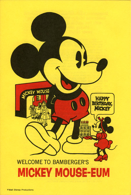 1973 proved to be an amazing year for both Mickey Mouse and me. It culminated in a "Mickey Mouse-eum," the World’s first Classic Mickey Exposition, a brilliantly mounted celebration of early Mickey memorabilia that featured my fast growing Mickey Mouse collection. It took place at Bambergers, in Newark, New Jersey, a location, as incongruous and illogical as the fact that such a show could happen, in the first place. Nonetheless, much in the same way as the humble Mickey Mouse toy that I had created, the year before, resulted in Worldwide repercussions, so did this exhibition. This was the first time that Classic Mickey Mouse was acknowledged and presented as an Art Object, worthy of collecting. It also inspired and created several future Mickey Mouse aficionados, who visited the show. Articles appeared in newspapers, across the nation.