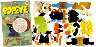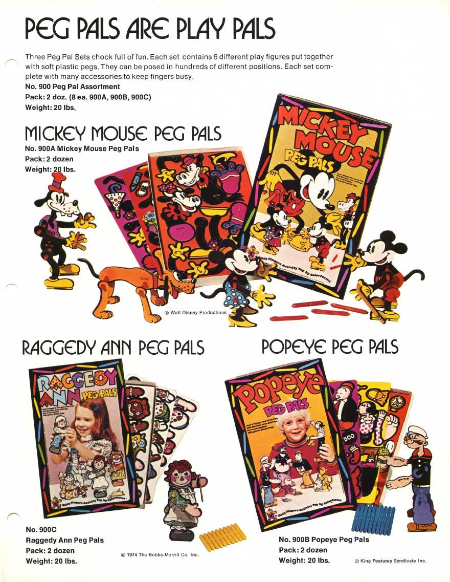 Below, is the catalogue sheet that included three different sets of Peg Pals. The beautiful child on the cover of the Raggedy Ann Peg Pals was Mike’s own daughter, Gretchen. Bill Basso did the figures for the Raggedy Ann set. Mike did the rest. The characters in the "Popeye Peg Pals" were based on a paper toy, called, “Hingees”. It was sold in the comic book department of drugstores for a dime in 1945. I added the Jeep.