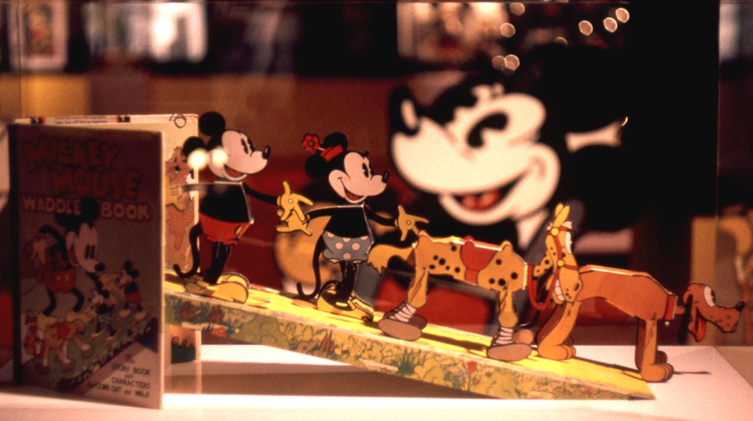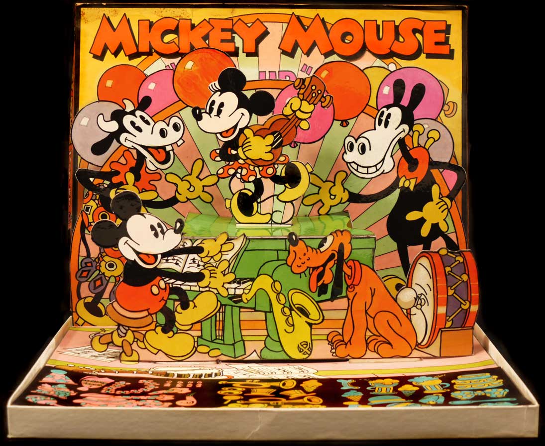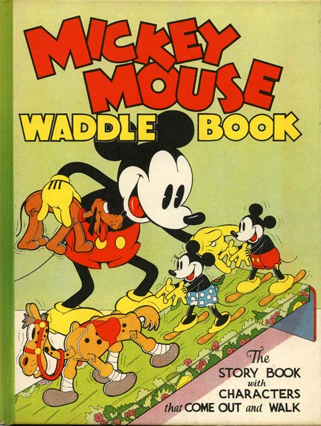 In the world of Mickey Mouse collectibles, few objects are more desirable than the fabulous, 1934 “Mickey Mouse Waddle Book” by Blue Ribbon Books. Hidden between the beautifully illustrated pages, were fragile cardboard figures of Mickey and his friends. When punched out and assembled, they waddled down an inclined ramp, then fell apart, and soon got lost. The Waddle Book is rarely found today, complete with the original “Waddles”.