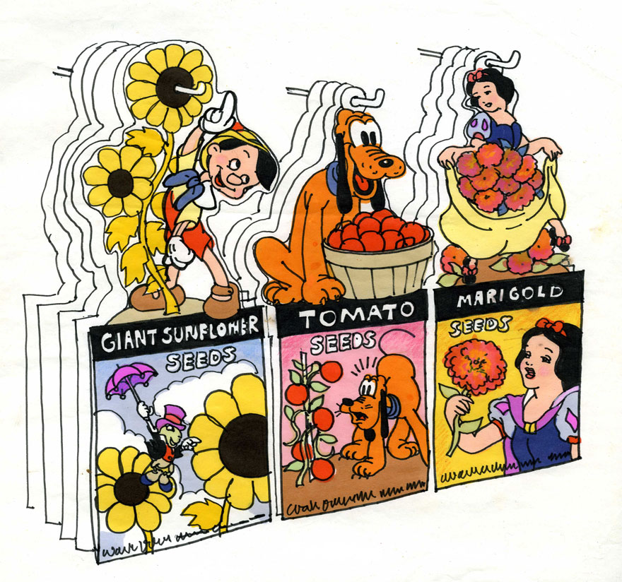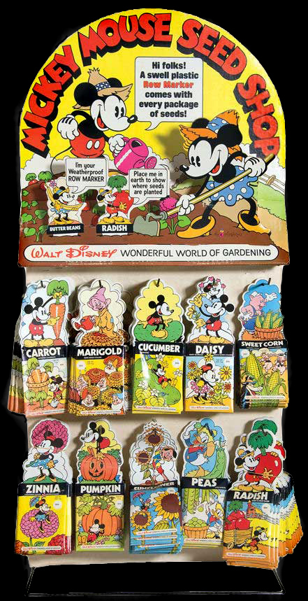Each package of seeds came with a waterproof plastic row marker that carried through the Disney theme. So, after the seeds were planted, a Disney Character remained to mark the place. While waiting for the seeds to grow, at least, a kid could look at it. And even if nothing eventually appeared, by then, he probably didn’t give a damn. There was a kind of Disney pay-off in the row marker itself.