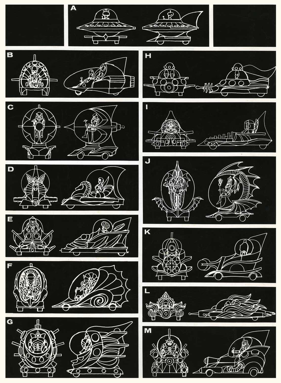 Sometime in 1969 I began work on a series of 13 “Hot Wheels” sized Vehicles, one for each of the Outer Space Men. Each Vehicle had a matching driver. When completed, the product boards were sent to Hong Kong, and several months later a crate containing 13 miniature models arrived at my loft in Manhattan. Like the Outer Space Men sculpts before them, the Asian artists had captured the essence of the designs, but the details left a lot to be desired. They were made of that same fragile clay as the earlier figures. God knows how I was going to re-sculpt those tiny drivers.