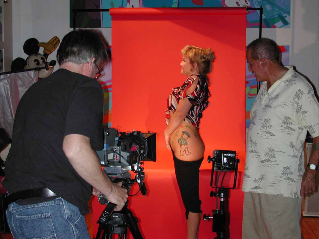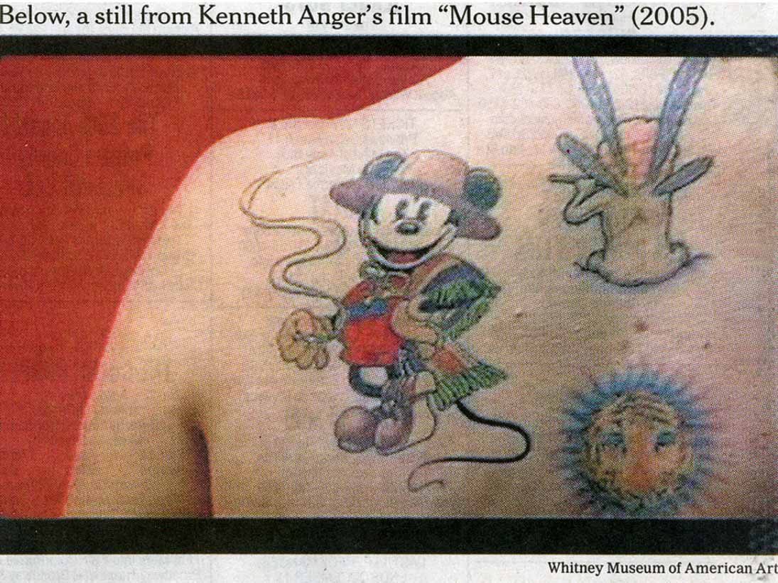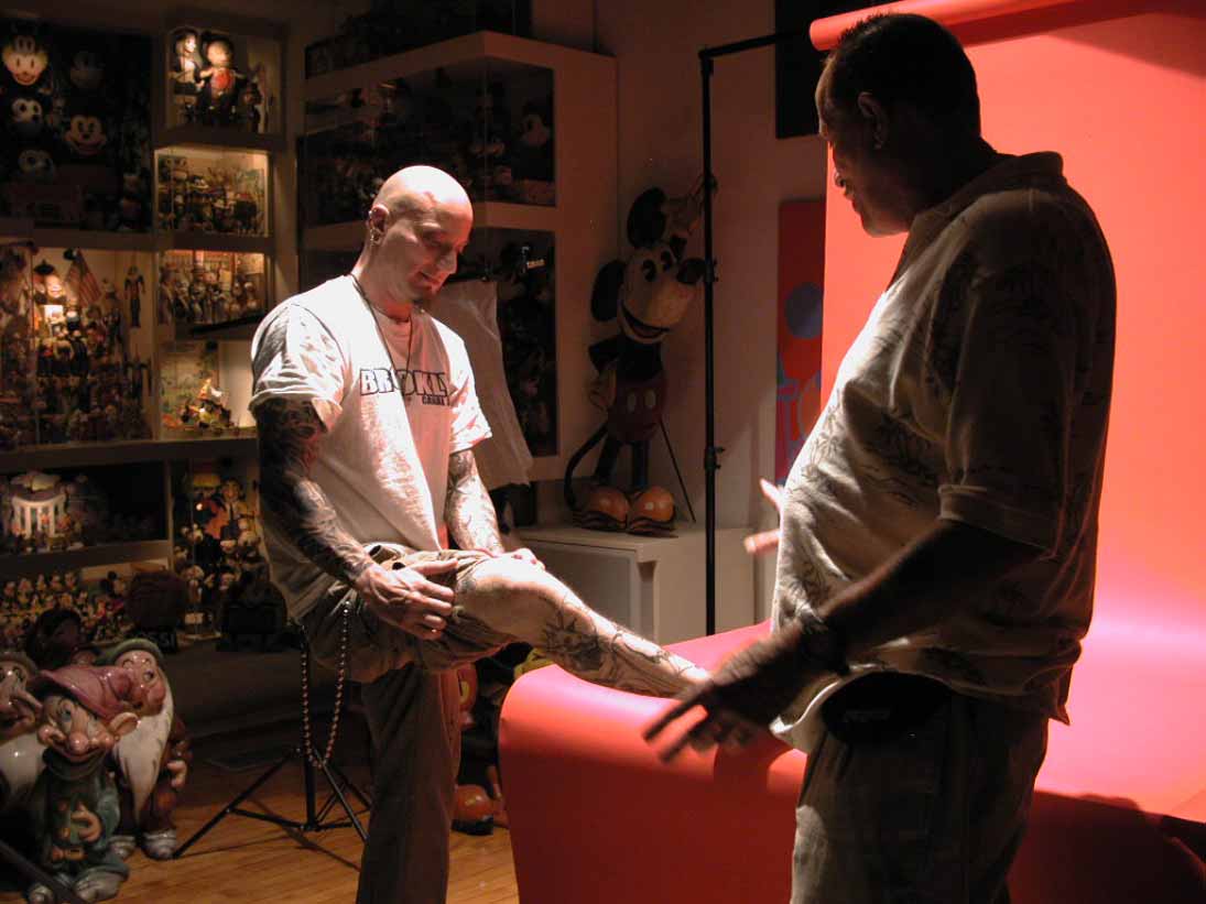 One day, during the filming, my daughter, Alexandra “just happened to drop by” with her friend Keith, the tattoo artist who had contributed several of the images that now adorned the art gallery that used to merely be her body. Keith is a huge fan of Kenneth. It was Keith who had so accurately reproduced my drawing of Mickey Mouse as Valentino, on Alexandra’s shoulder. I might add, unbeknownst to me. She was not surprised when Kenneth put her tattoo in the movie. In fact, this image became somewhat iconic. It’s one of the stills that came to represent the film.