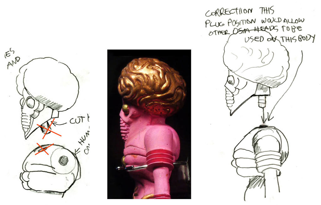 In my haste yesterday, I quickly whipped a plug in, without thinking. Looking at the emails again today I realized the mistake. I imagine you would notice this, but I am sending a correction just in case. It has to do with the placement of the plug and socket on Orbitron’s head and chest/shoulders. I showed it incorrectly on the angle of his chest. It should actually be higher up below his neck. Not that his head can be used on any other bodies, nonetheless by moving the plug and hole up higher, where a “normal” neck would be, other heads could be at least used on his body.