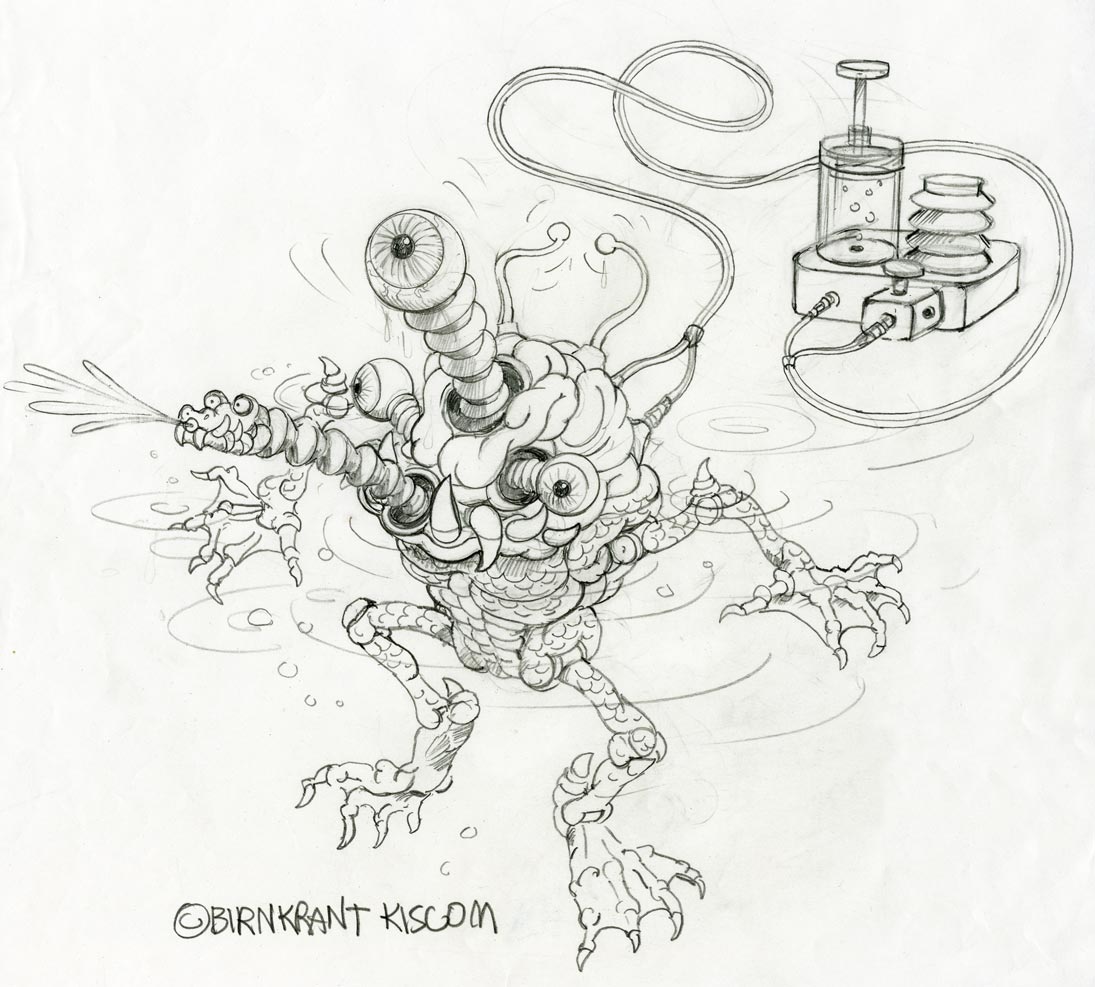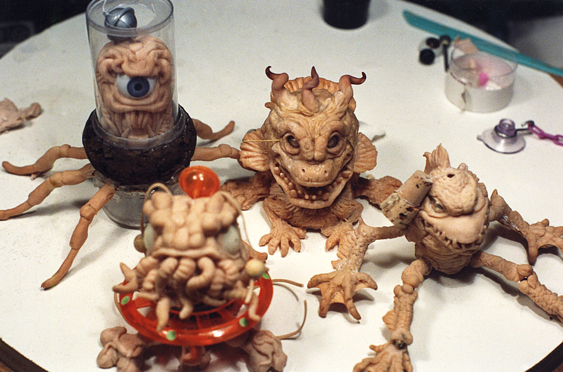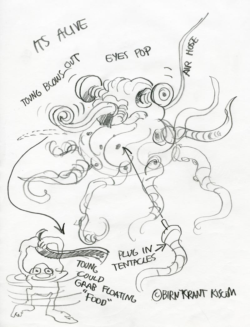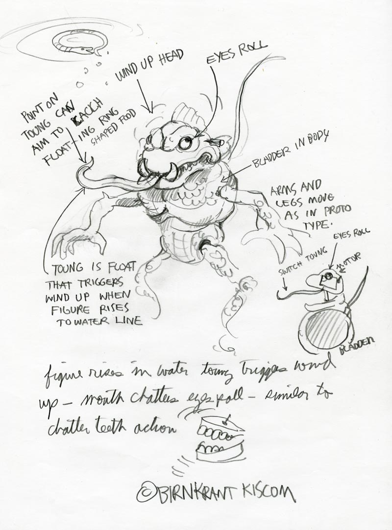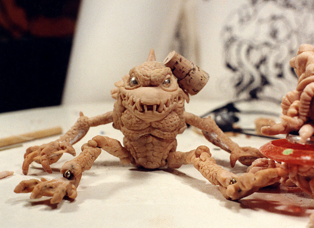 There were no preliminary drawings. I just sat down with Super Sculpey, and made them up as I went along. The first required a wire armature. It was a sort of scary frog. Three of the figures operated by filling them with enough air to lift the creature to the surface of the water. There was a sort of valve on top that was held closed by a small float. When the figure reached the surface, the float would open the valve and release the air. Then, the figure would sink to the bottom, waiting to fill with air, and rise again.