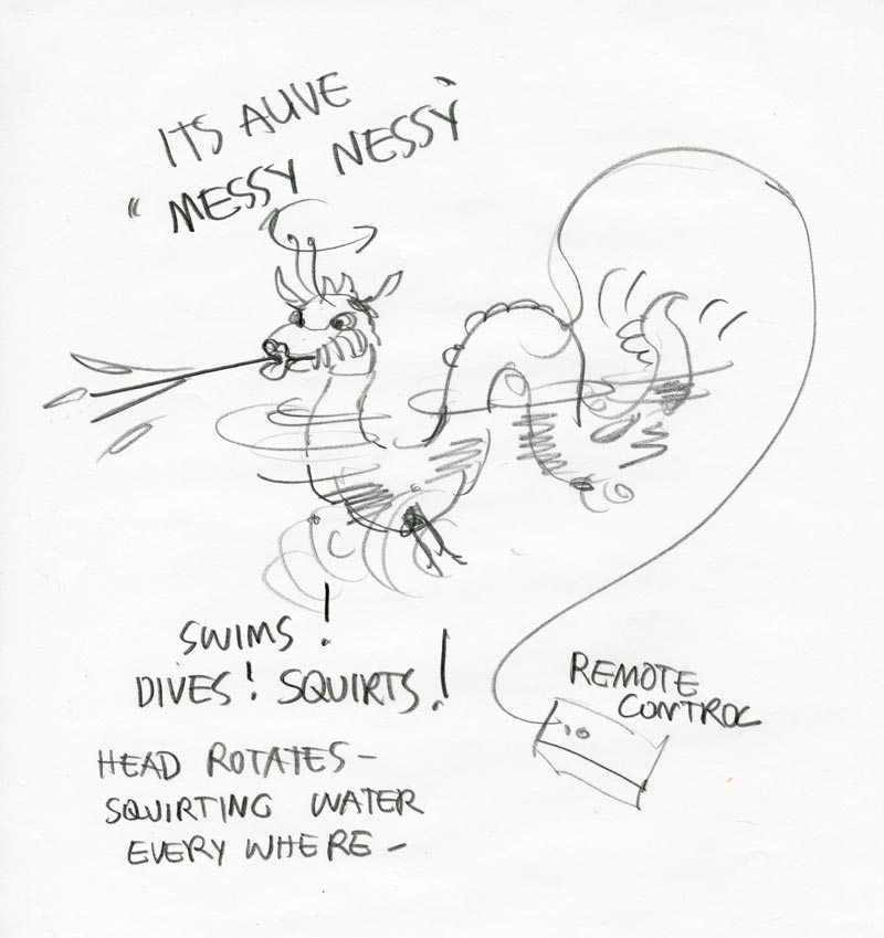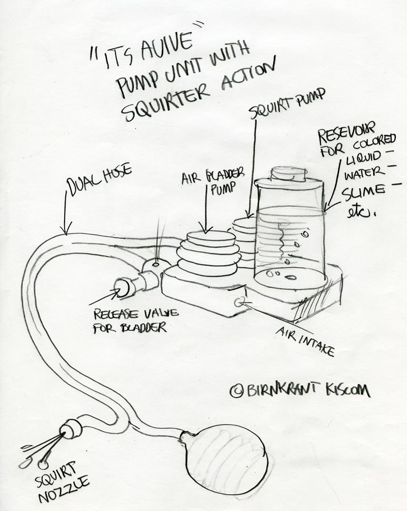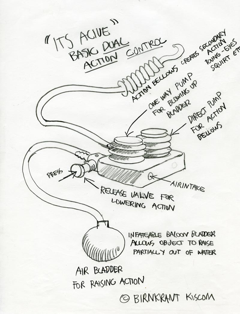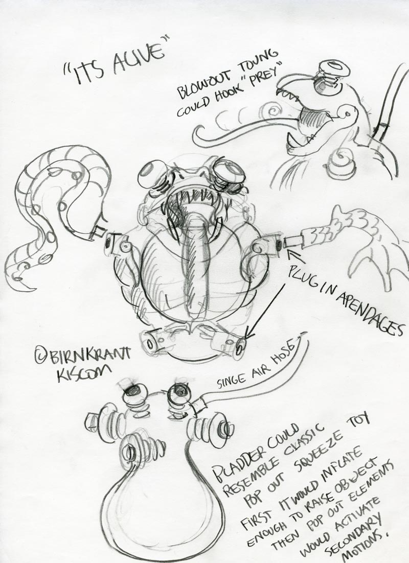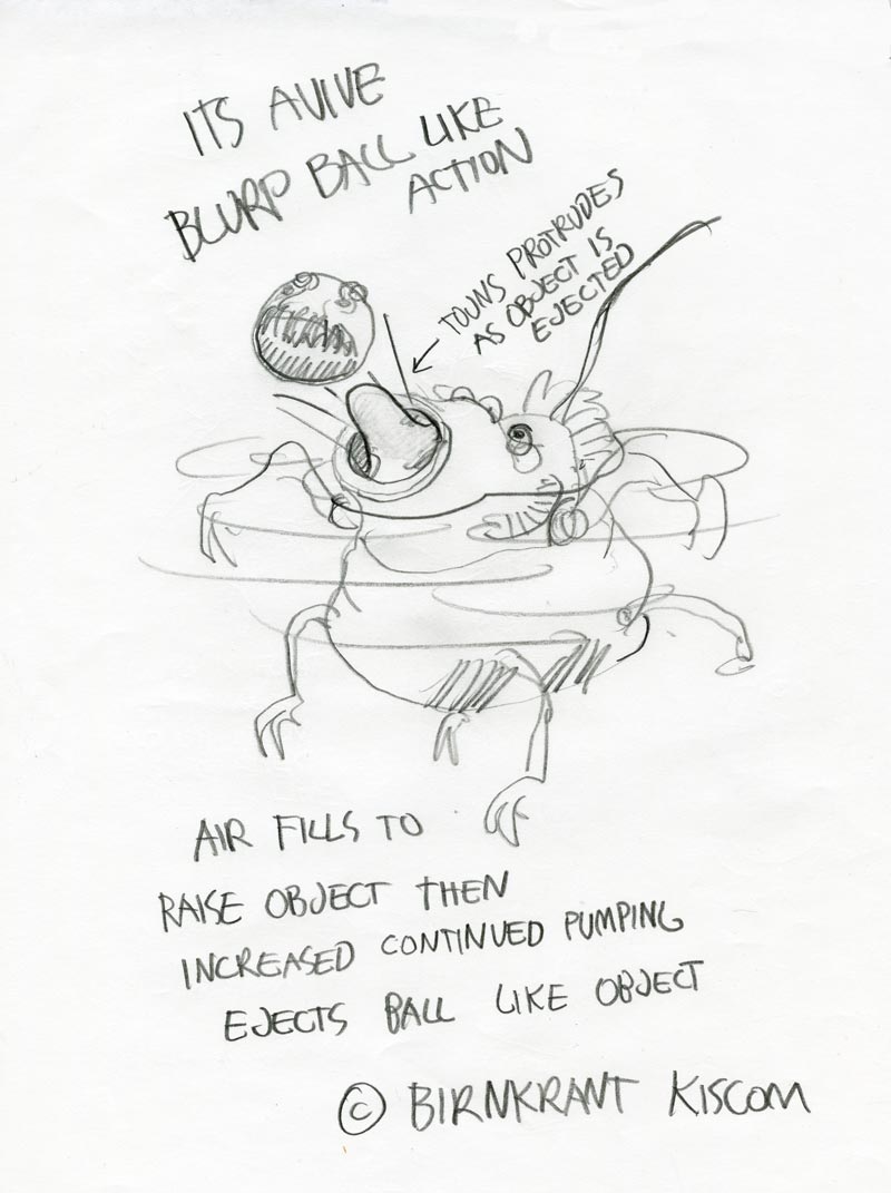 Years later, the memory of these simple but effective gadgets became the inspiration for the concept that came to be called, “It’s Alive.” The concept had some problems, in that it had to operate in water. And it worked best when powered by an electric air pump, in which case, it would move continuously, as if it was alive. But it could also be powered by a hand pump that could be included in every package.