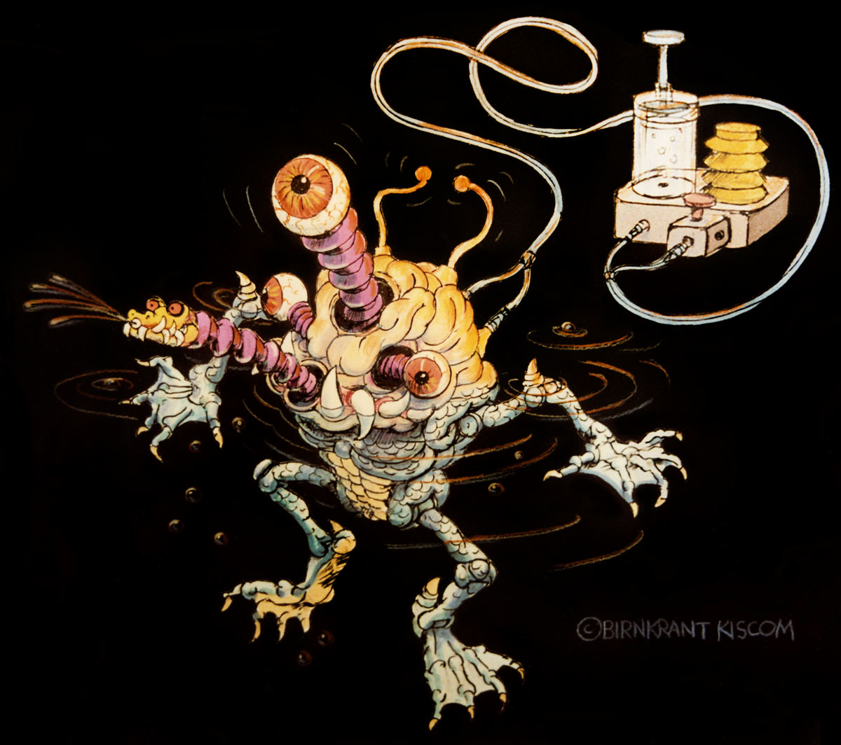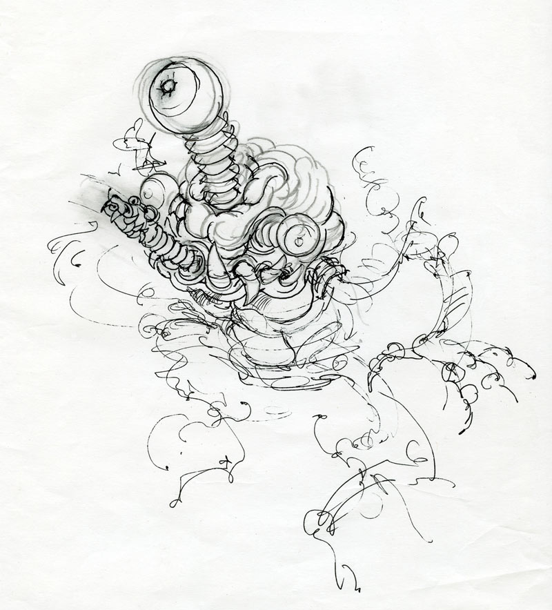 This crazy critter turned into a sort of Cthulhu. That wasn’t intentional. It was, more or less, just a doodle. Nonetheless, it became the model for a head I drew, years later, as a variation for the Outer Space Men.