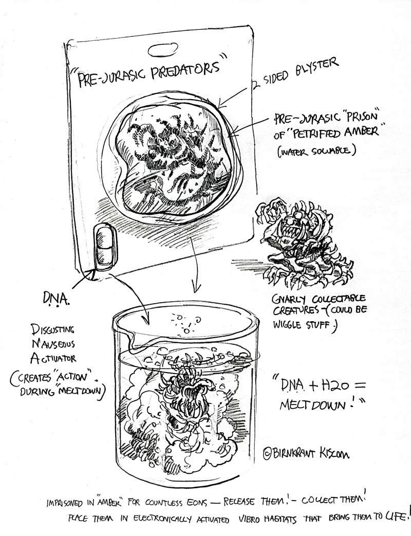 In an attempt to make a product that would be more educationally uplifting, because it was scientific, we suggested that this series of Pre-Jurassic Predators had become encased in amber, a million years ago.  The amber would be just cloudy enough to offer a tantalizing hint of the horrible creature encased inside.  Fortunately, the amber would be water soluble.