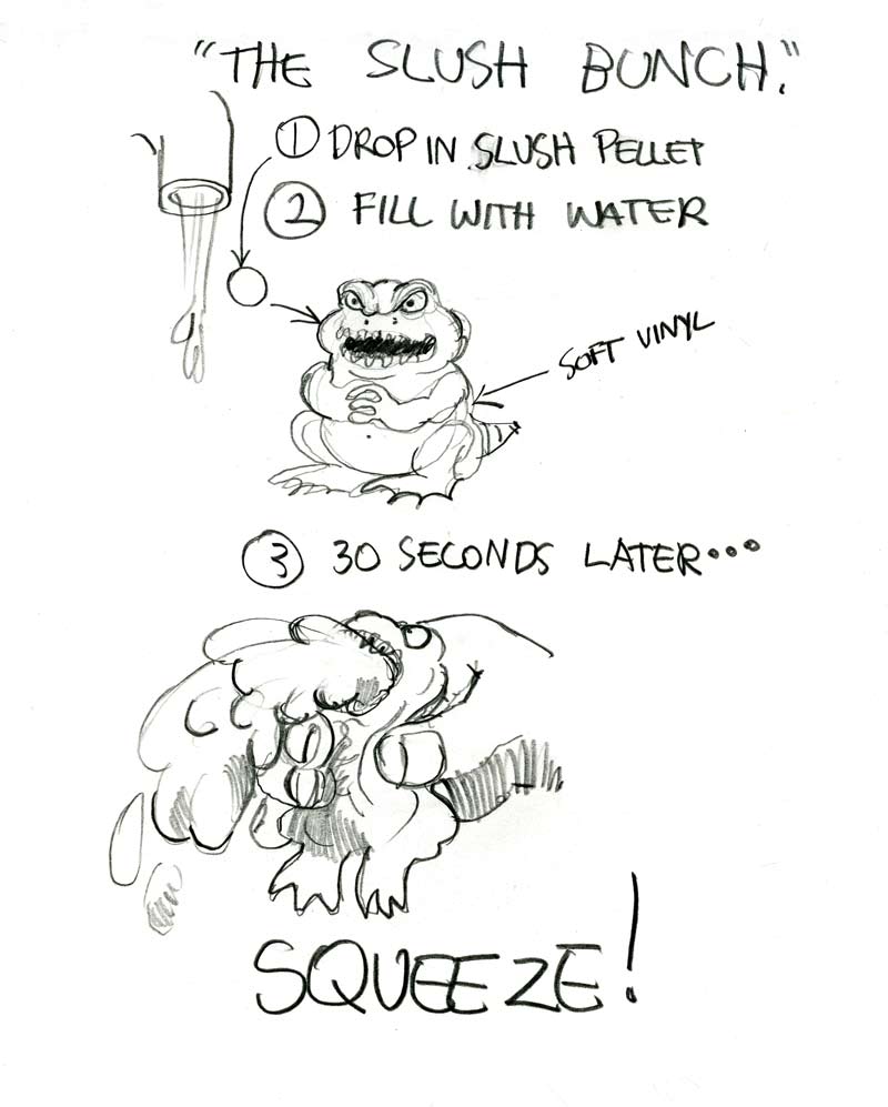 The Slush Bunch suggest that perhaps there could be a tablet that turned to slime, when water was added.  Then, the creature throws up!  What Fun!