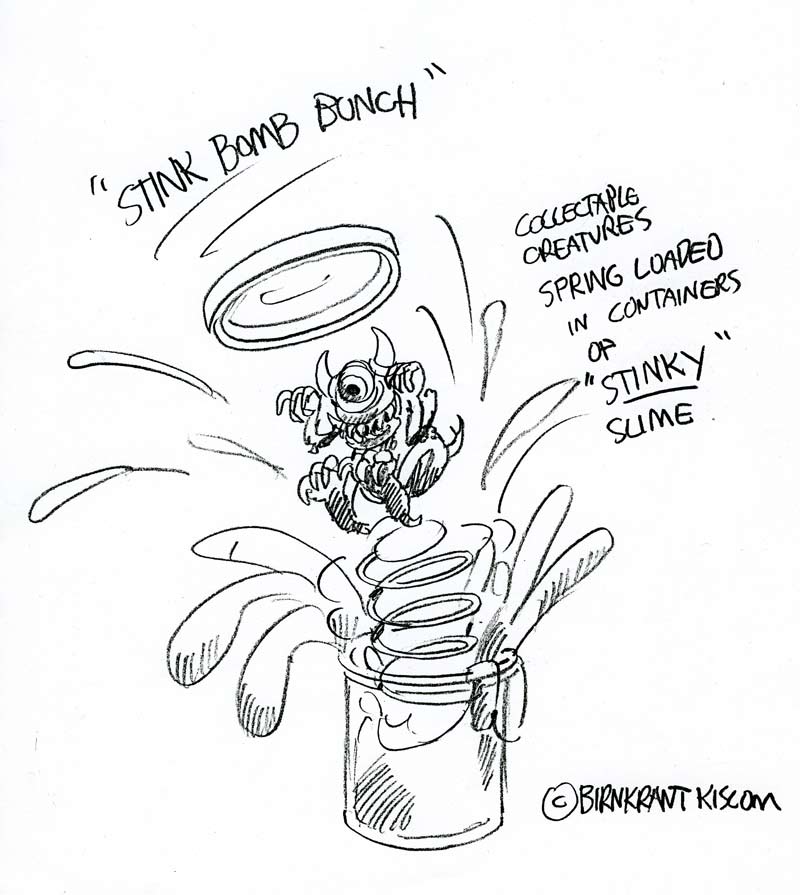 These were the days when nasty gooey things were king, and all sorts of hygienic manufactured harmless nastiness ruled the toy industry.  Something called slime was popular.  Slime tended to smell nice. Here, we proposed adding a revolting odor, and a spring to catapults the slime soaked creature into the users face.