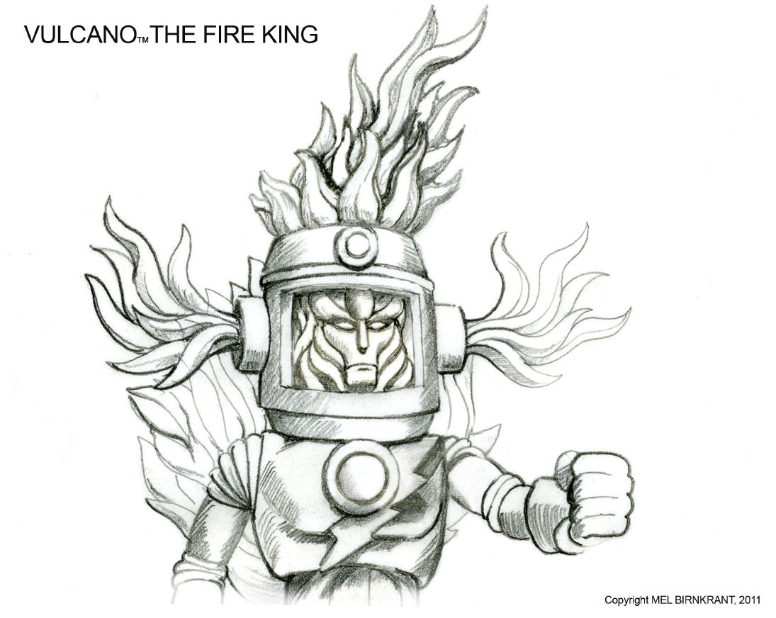 So, here I am, offering two solutions: The first one being: instead of a new head, a new helmet that would successfully transform Inferno into “Vulcano The Fire King”. The flames would, of course, be transparent ORANGE, as would those on his head and back! And his regal attire would be Bright Gold from head to toe!