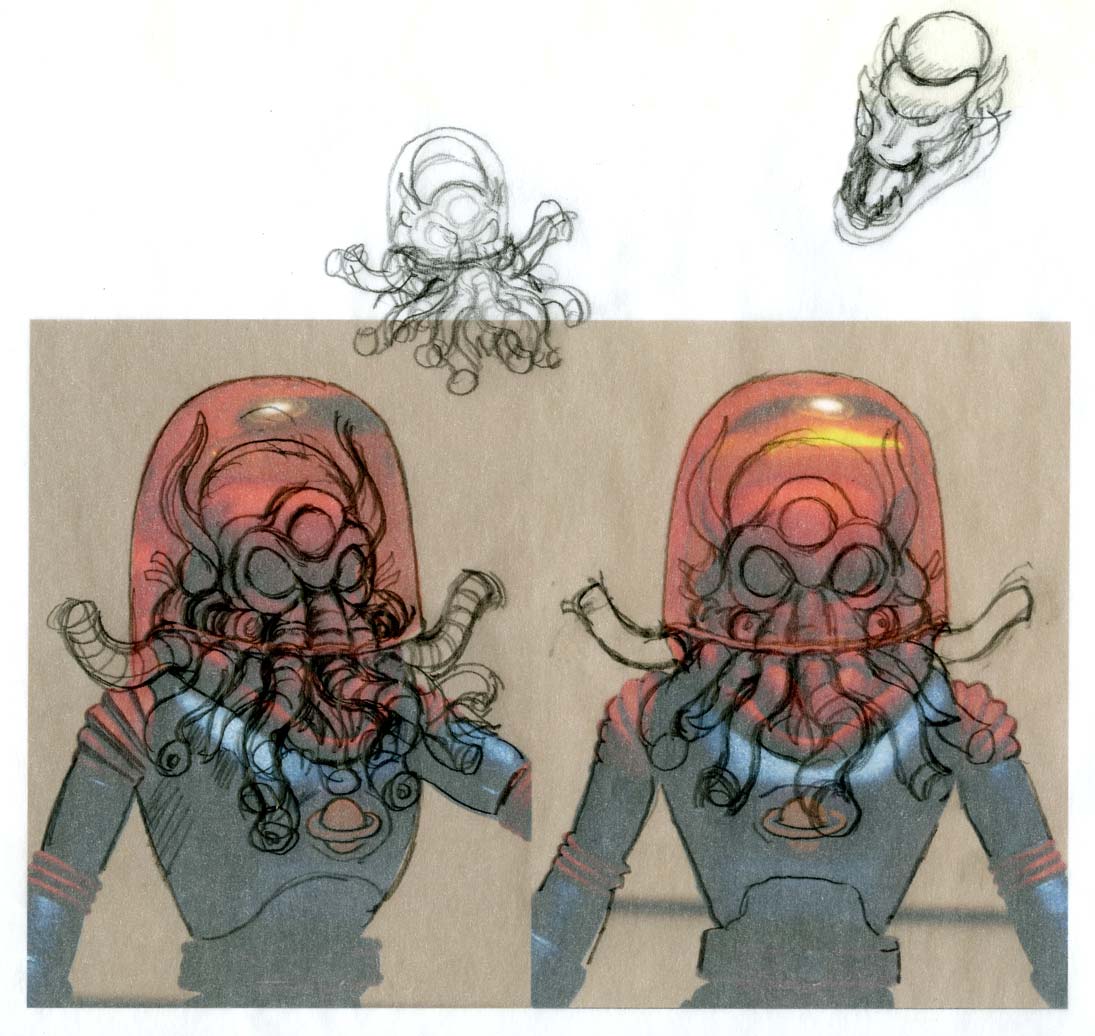 Meanwhile, here I am, staring at the head above. It’s love! I can’t take my eyes off it. I should be moving forward to Astro Nautilus variations. But, having just dug out my box of ancient Magic Markers to color in the Quick Silver’s fire, and discovering that after ten years in hibernation, they still had some juice in them, I can’t resist the temptation to color in the head in question. In this case, a little bit of color magic is all part of the character’s conception.