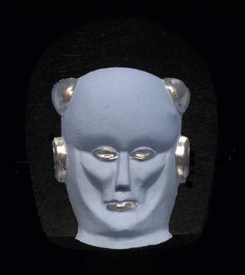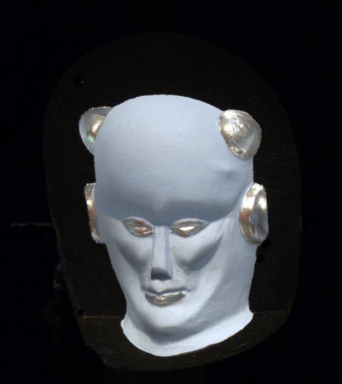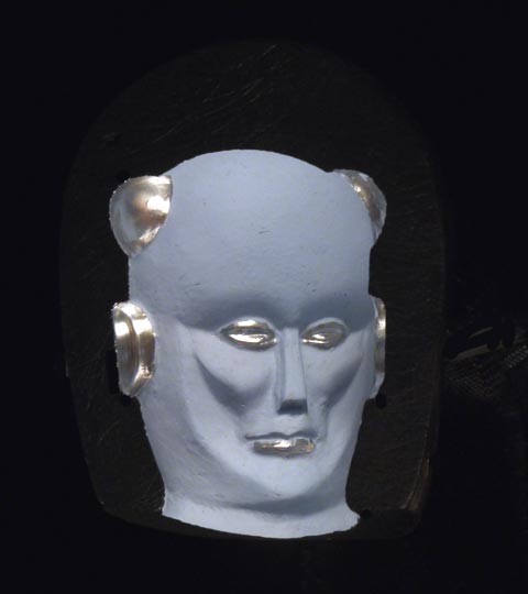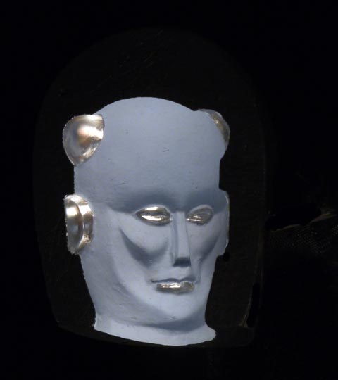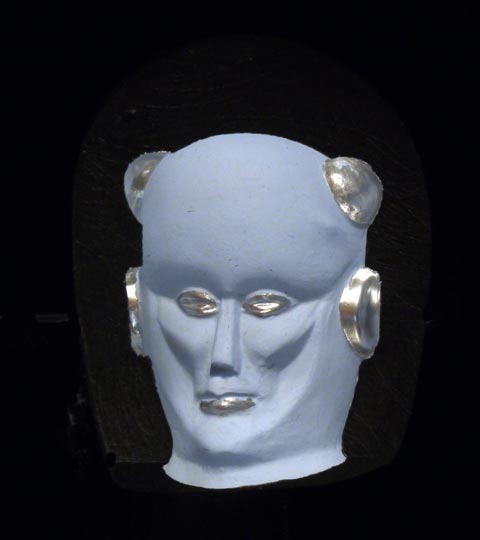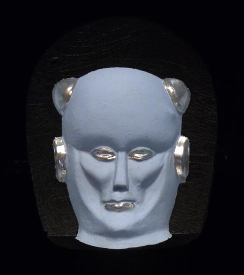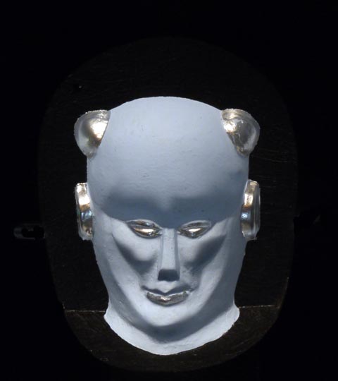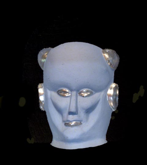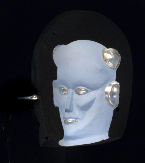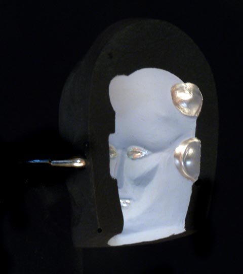 The interior of the scull will be painted silver, but the eyes will remain clear with a dot of transparent red applied, so they will emit light. Seen from one side, the head will appear transparent with a solid silver scull inside. From the other side, the viewer will see an illusionary scull, (like the test heads above) set into a transparent frame. By the way, "ELECTRON MINUS" is his name!