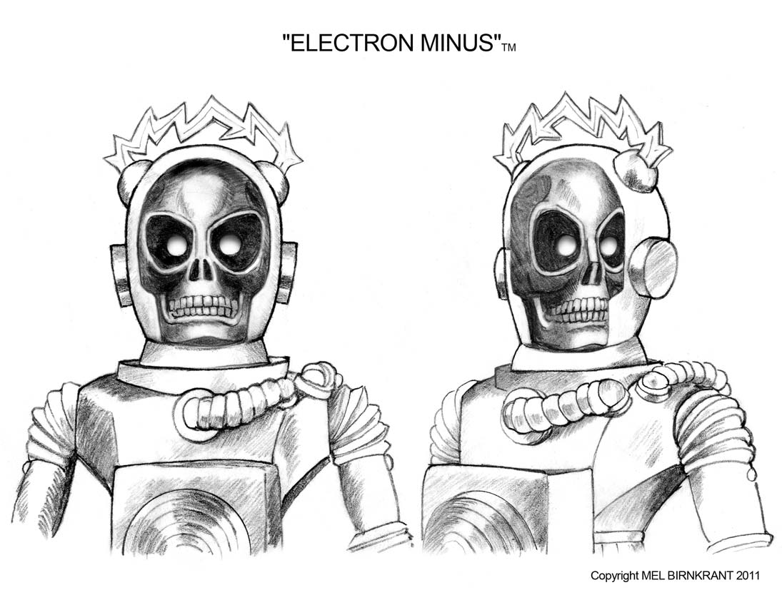 Electron has the kind of face that makes one feel that every member of his race might look somewhat the same. Like the familiar Gray, I sort of think about Alpha Seven the same way. I also like the possibilities of electricity to be either Positive or NEGATIVE, as well as the ability for Electron, being "Frozen Energy", to defrost, dematerialize, and dissipate. So, that is the direction I intend to take, and not seek to create a wild new look, but rather to do something mildly wild, incorporating his existing face.
