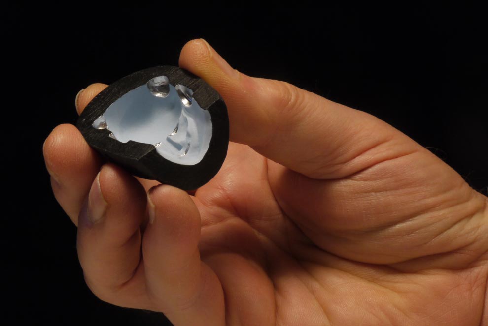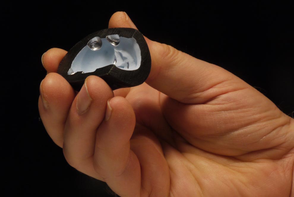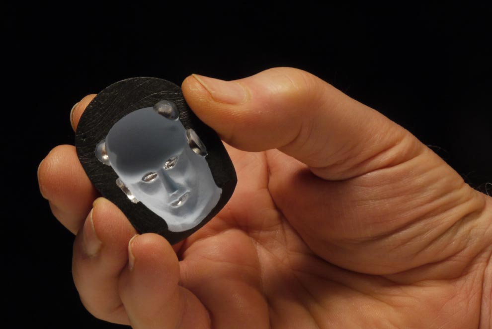 In Version One his head was hollowed out of a transparent piece that filled the back half of the helmet. In Version Two, his skull will be hollowed out of the back of his transparent head. One will be able to view it either way. From the back, which can become the front, we will see his skull turning in space as in the experiment above. And from the front we will see his transparent head with skull inside. As the neck is completely round, his head can be rotated to face either way!