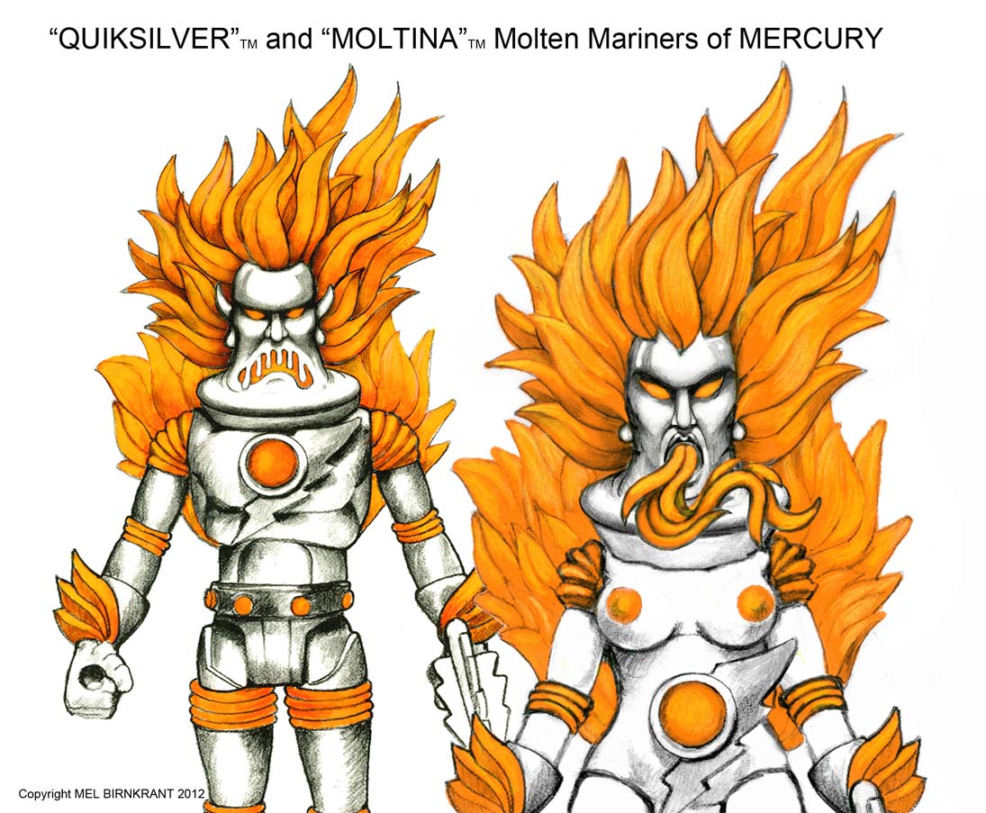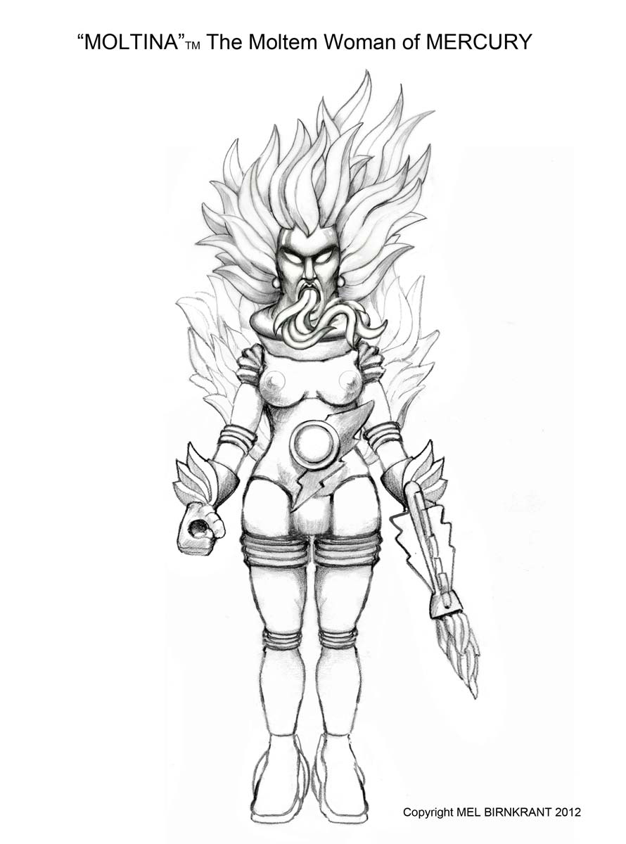 “MOLTINA” The Molten Woman of MERCURY has evolved. She will consist of a new head and tongue, with the same upper torso used by Terra Firma and Ohpromatem. She will also use Inferno’s fire, weapon and chest emblem, inserted in her navel. She will need new fire shoes and flaming gloves.
