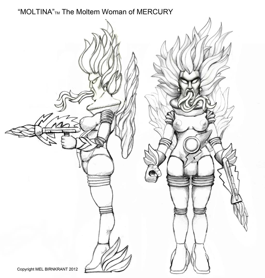 MOLTINA, the Molten Woman of Mercury, is the hottest babe in the Galaxy. Not content to merely melt hearts, on her native planet, Mercury, she travels through the frigid depths of Outer Space, aboard an incandescent Chariot of Fire. Her mercurial libido is ablaze with inextinguishable desire, as she passionately strives to oxidize with every Outer Space Man she encounters, along the Milky Way. Therefore, all ye sailors of the Starry Sea, Beware! MOLTINA’S smoldering kisses erupt in tongues of flame. To mate is to incinerate! And many an ardent would-be lover, drawn to MOLTINA, as a moth is to a flame, has been known to self-immolate, in her fiery embrace.
