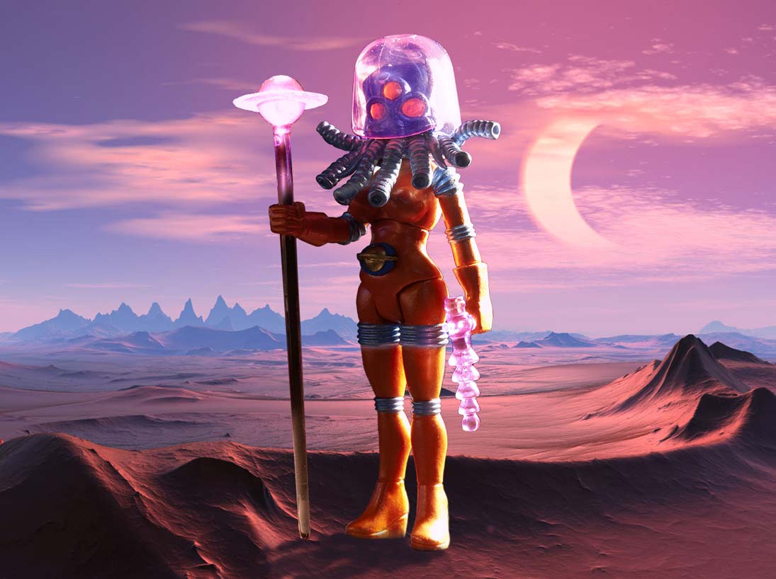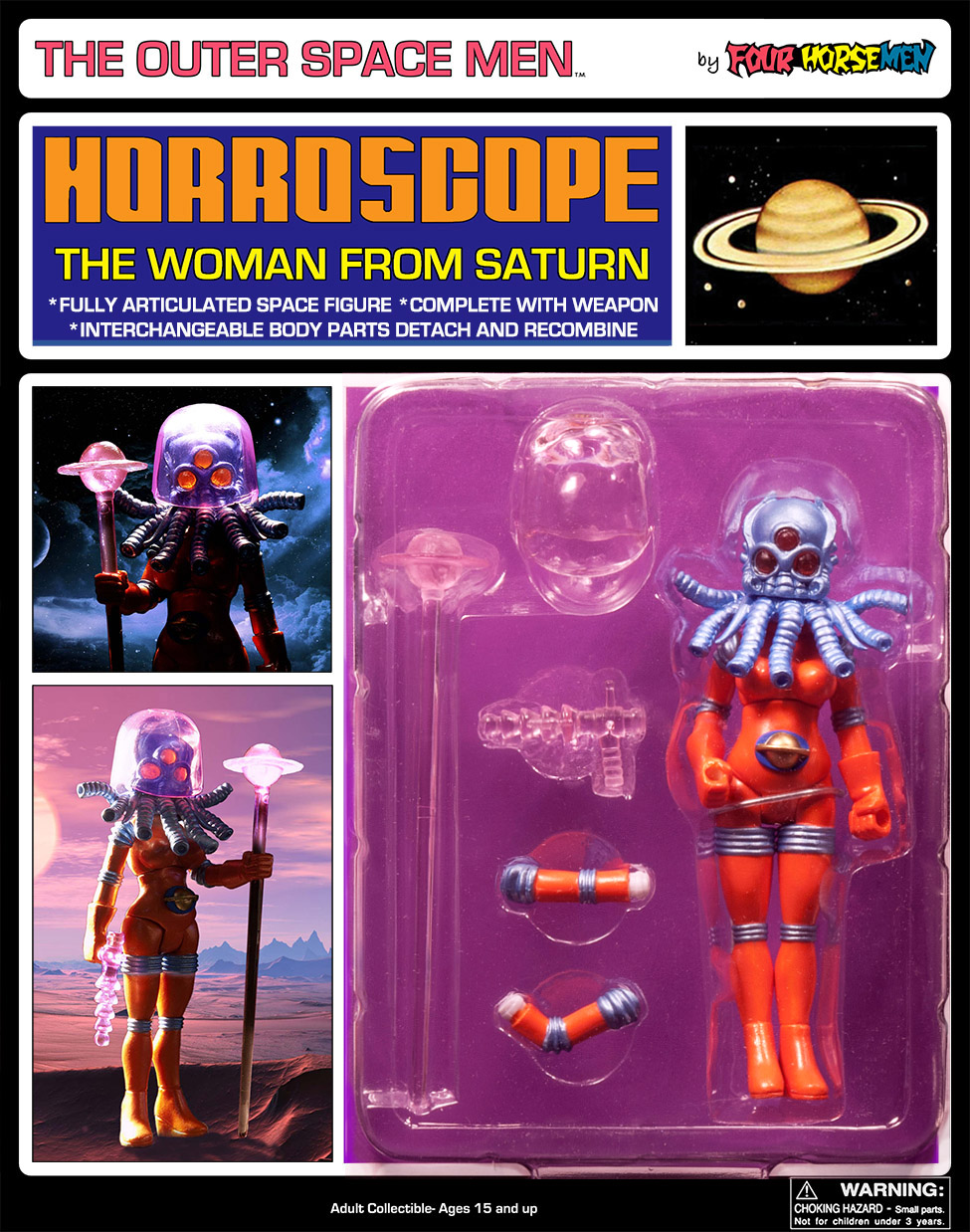 Of all the Seers on the Planet Saturn, XODIAC’S daughter, “HORROSCOPE” is the most all-seeing. A “Third Eye” in the middle of her forehead, enables her to scope out intergalactic events, not only “in the here and now”, but also in the distant future. Nothing escapes her penetrating gaze. Her powerful intuition enables her to predict the course of Destiny, month by month, and day by day. Her nose for news, and other people’s business, can sniff out scandalous behavior, not only, on her native planet Saturn, but also on far distant Worlds, light years away. Tuning her Crystal Scepter to the vibrations that resonate from the biggest satellite dish in the Universe, Saturn’s Majestic Rings, HORROSCOPE can” ring up” her interstellar friends, to hear the gossip of the Stars, from Jupiter to Mars, and “dish the dirt”, across the Gulf of Outer Space