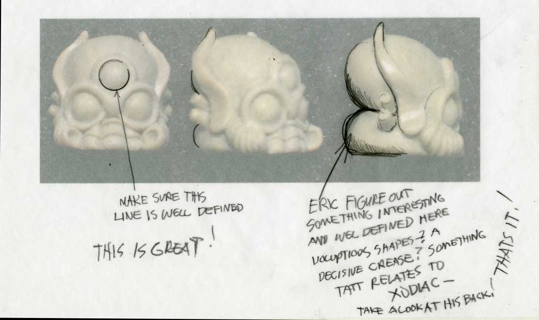 Horroscope looks great. Please turn her around and examine the back of her head. Then compare it to Xodiac. Rather than this general bowling pin shape please supply a crease or something, not only more interesting but she will relate a little more to Xodiac back there. Also please make sure the perimeter of the eyes are clearly incised, there is a slight mushiness about the lower round contour of the upper eye. These defining lines are necessary as the eyes are to light up and the contrast will be clear.