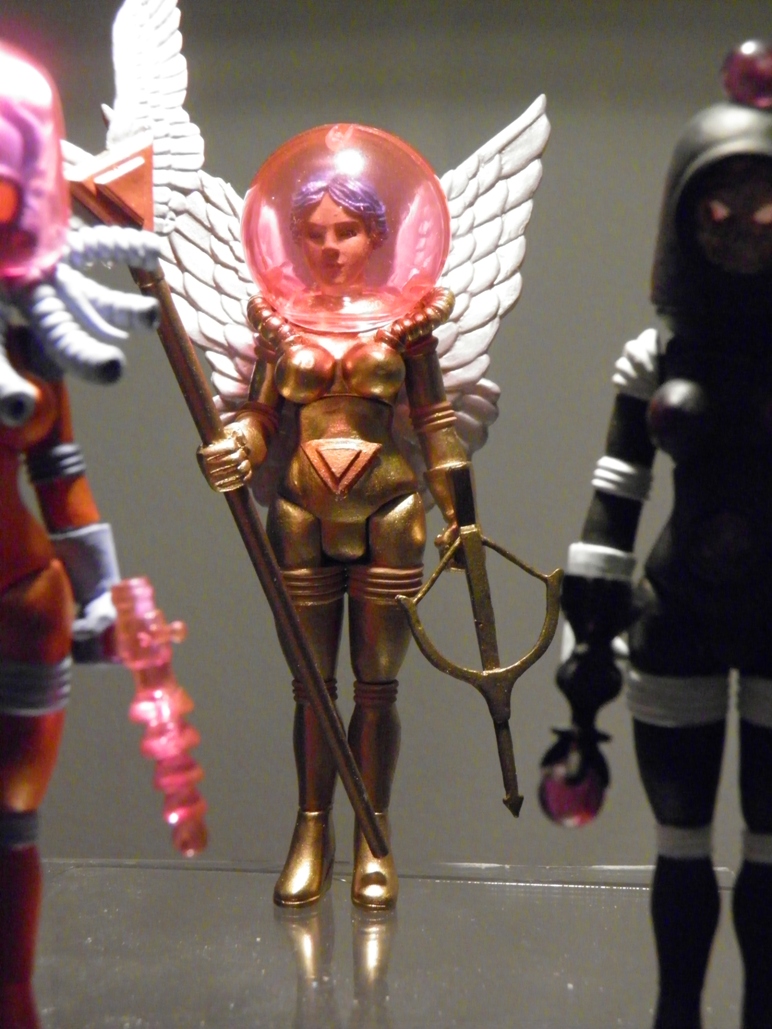 Her COLORS: were to be the same as Commander Comet, with two changes. 1. The Gold of her body would have been BRIGHTER than his. 2. Her hair should have been a medium light warm blue metallic, about the same value as Comets hair. This would have looked good, through the pink helmet, and mix a nice shade of purple. All the rest was to be the same as Comet, the flesh color on face and joints, the same emblem color, and the same color wings.