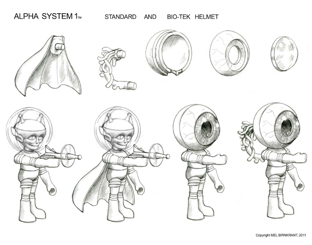 Now, I saw a way to incorporate them into the Alpha line, not as a new character, but rather as an accessory. Being the same size and shape as Alpha 7’s helmet, they were halfway there already. With a lens in the front and a pupil to peek out of, they could actually be interesting.