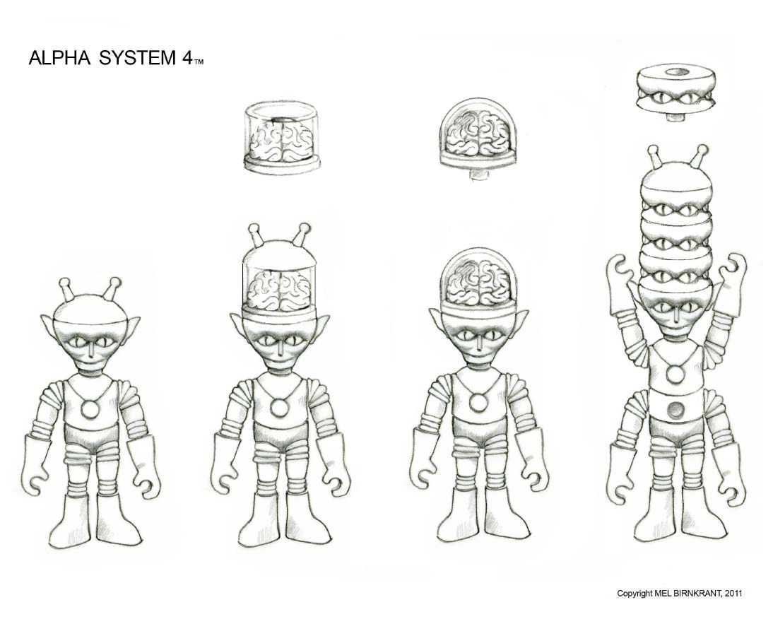 But an eyeball, and a cute clip-on cape, does not solve the problem of limited play value. At this tiny size, Alpha’s joints had to be few. This was a fact that played on my mind, in trying to expand the line. What could one do to generate play in a figure this minute?