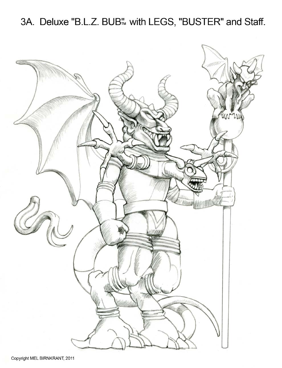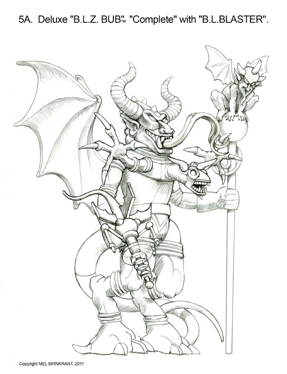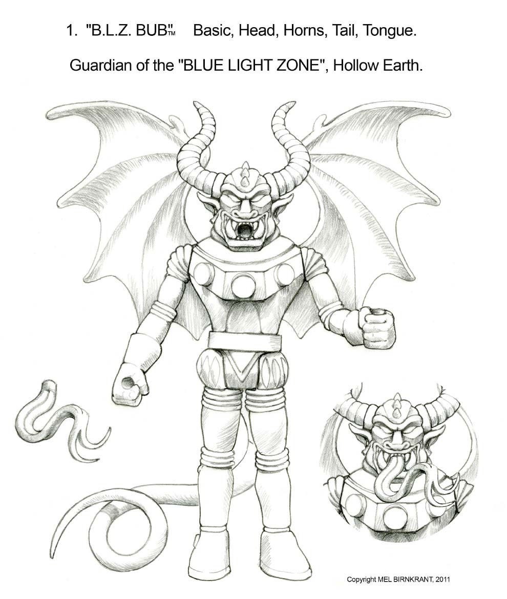 Come fly on Wings of Darkness, into the depths of Hollow Earth again. Through the Secret Polar Portals, well hidden from mere Earthly Mortals, we pass the Ring of Blackness, where eyeless creatures, blind and hapless, who've never seen, nor been seen, grope aimlessly through the endless caves and catacombs of night, hungering for light. Now, soaring over Monstro City, Capital of Mystron’s Minions, ablaze with the radiant red-orange energy of effervescent Lava Light, we travel onward, ever downward, beyond the legendary Gates of Hell, and deep into the “Blue Light Zone”, the place where Demons dwell. Here in the Ultra-violent glow, we meet the mighty “BUB”, Guardian of the “B.L.Z.”. His bosom buddy “BUSTER” and his Imp “PRESARIO”, affectionately, call him “BUBBY”. But he is, and will always be, “B.L.Z. BUB” to you and me.