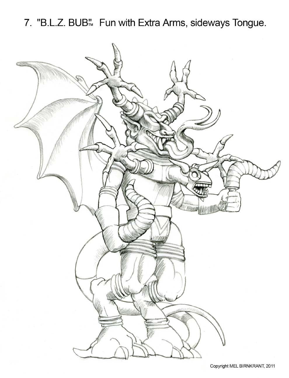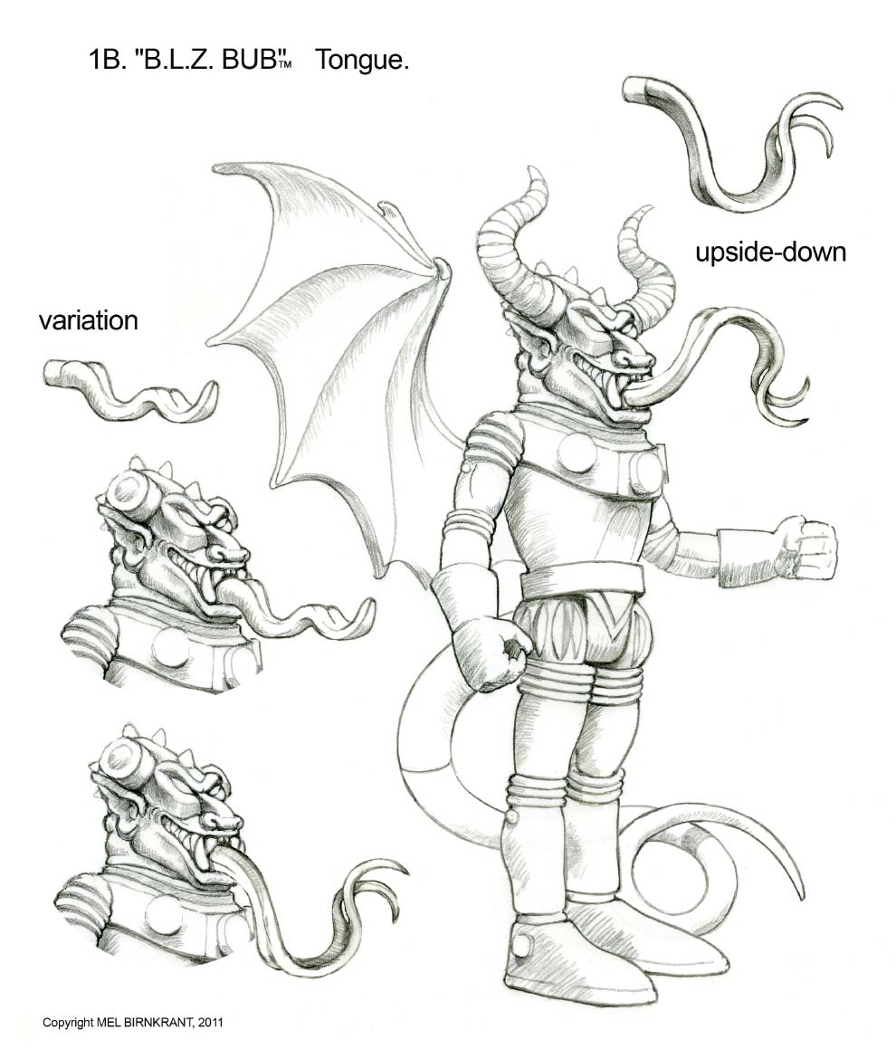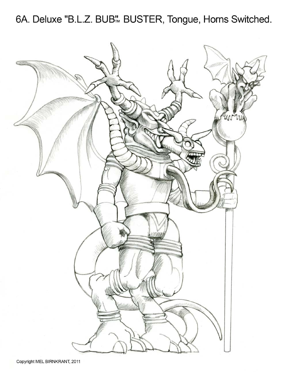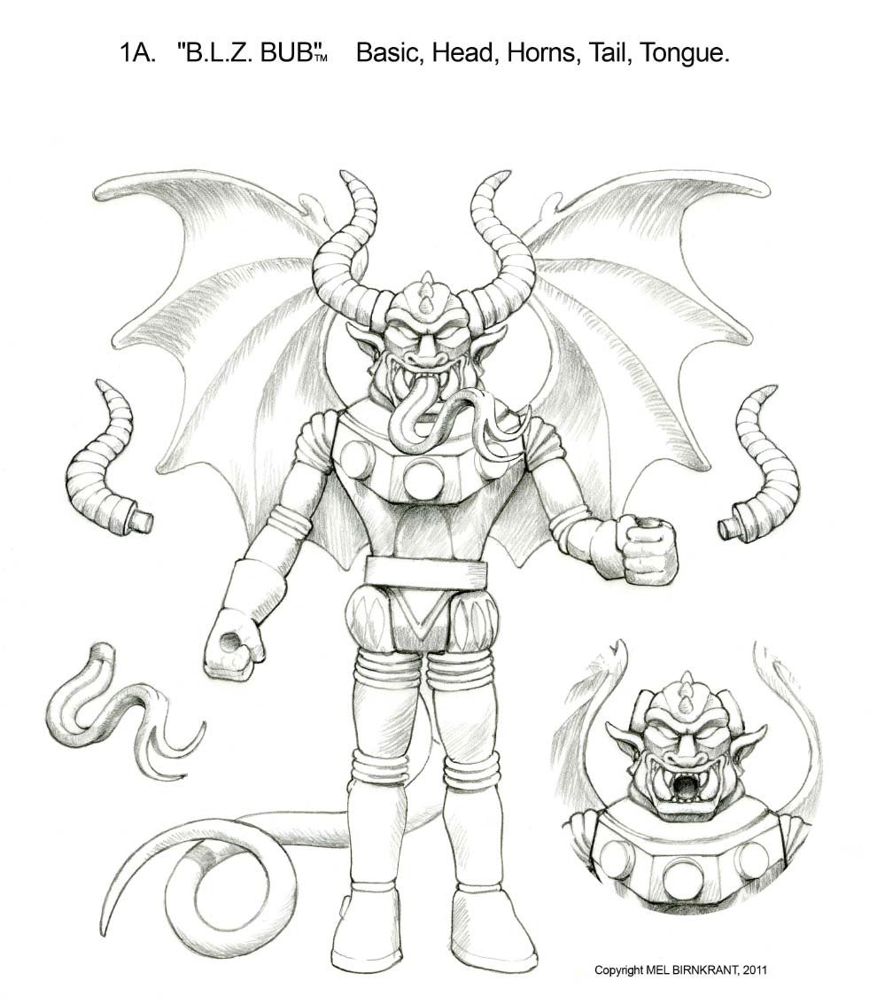 Come fly on Wings of Darkness, into the depths of Hollow Earth again. Through the Secret Polar Portals, well hidden from mere Earthly Mortals, we pass the Ring of Blackness, where eyeless creatures, blind and hapless, who've never seen, nor been seen, grope aimlessly through the endless caves and catacombs of night, hungering for light. Now, soaring over Monstro City, Capital of Mystron’s Minions, ablaze with the radiant red-orange energy of effervescent Lava Light, we travel onward, ever downward, beyond the legendary Gates of Hell, and deep into the “Blue Light Zone”, the place where Demons dwell. Here in the Ultra-violent glow, we meet the mighty “BUB”, Guardian of the “B.L.Z.”. His bosom buddy “BUSTER” and his Imp “PRESARIO”, affectionately, call him “BUBBY”. But he is, and will always be, “B.L.Z. BUB” to you and me.