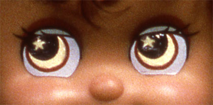 Then the CBS designers altered the round eyes by adding puffy cheeks; thus destroying the dolls only product feature, a subtle little nuance that involved Glow in the dark! The eyes were configured as perfect circles in the style of Betty Boop. But in this case, the white of the eye formed a Crescent Moon and the reflection in the pupil was a Star, which in the dark would magically appear. Stars on their sleepwear glowed in the dark as well.