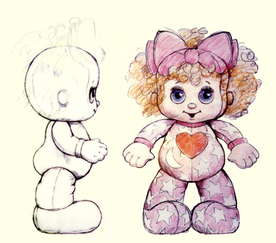 Once the CBS design department got their hands on the dolls themselves the worst was yet to come. Below is a drawing I made to demonstrate how l visualized the dolls. I saw them as soft and cuddly as they were meant to take to bed.