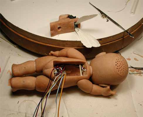 Her “electronics” remained to be created. Thus, her features had to be simulated in order to be demonstrated. The prototype was operated from a control panel connected by a bunch of wires. Her wings were animated by a tiny wind up motor that in production would have been electric. Inside her head there was a speaker.