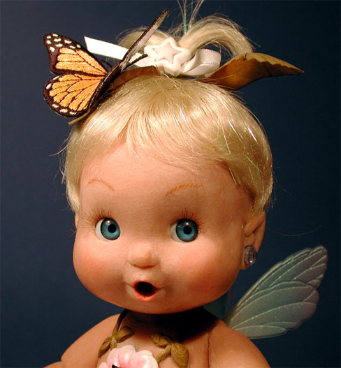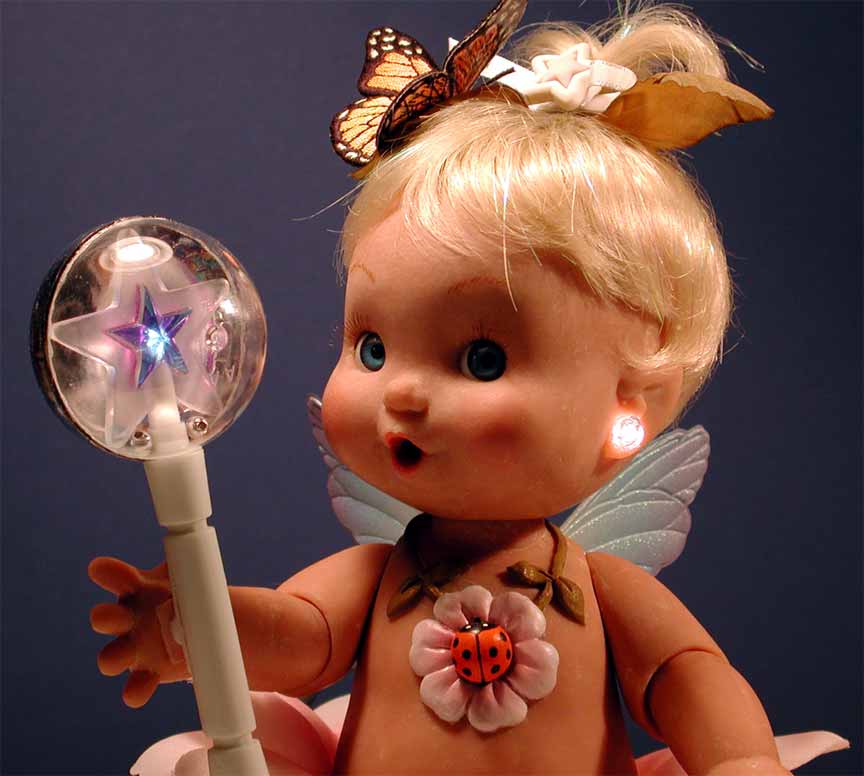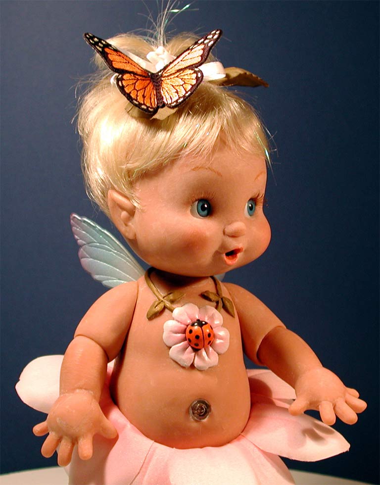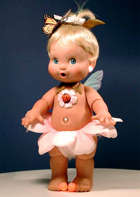 “Tina Twinkle” was a Fairy Baby. We called her “Twinks” for short. Gosh I loved this doll! She was the sweetest doll I ever sculpted. Tina was a new size, in-between big and small. And she had a great look about her. I felt sure she was a winner. She also had a ton of features, way too many, really: Twinkle earring, twinkle bottle, twinkle rattle, twinkle pacifier, twinkle tummy, twinkle toes, and on top of that she spoke, played music and could flap her wings and "fly".