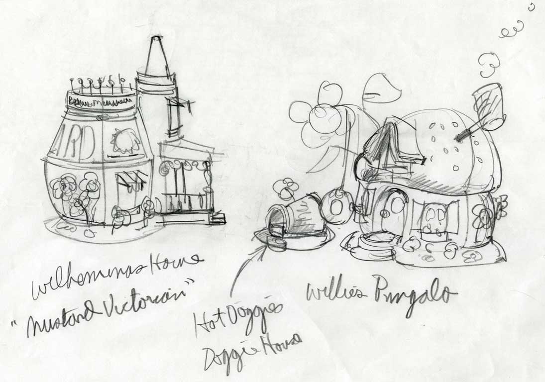 There were other play sets as well, Wilhemina’s house, and Willie's "Bungalow." Alas, I don’t have prototypes of those. But here are some preliminary sketches and final renderings for both.