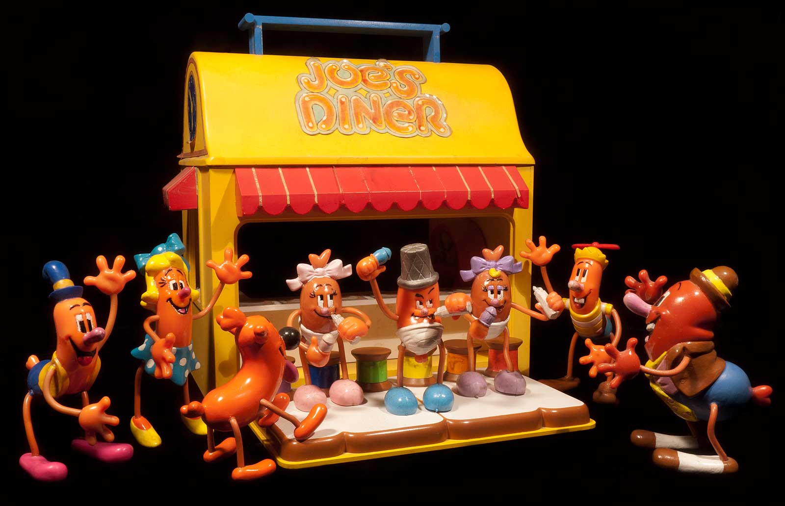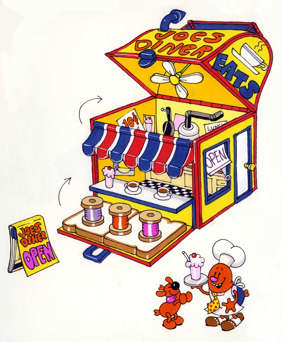 Harvey dove right into this enthusiastically, and rendered it quite beautifully as a prototype that somehow ended up with me. He even added a “feature,” in which the spools of thread that the Weenies used as barstools would be color keyed to play music. This brings us to an issue that haunted the toy industry, and me, ever since toys began to be advertised on TV. It was no longer enough to make a toy that relied on a child’s imagination to achieve sound or animation. Everything suddenly had “do something,” something that would look or sound dramatic in a commercial. That certain something was often powered by batteries. So, Joe’s Diner became “Joe’s Musical Diner." The set also doubled as a carrying case for the Weenies.