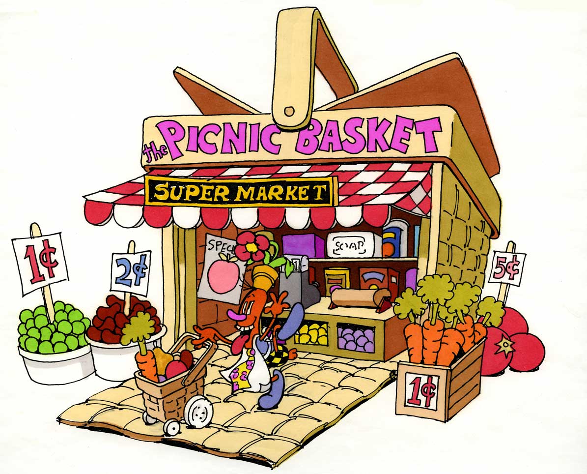 Here’s “Wacky Weenie’s Picnic Basket Super Market.” Scanning these drawings now I am reliving memories. I see that when this drawing began I had no idea that the market would be his. Wacky got added in impulsively. My God, those were fun times, the way this concept grew spontaneously . I like that little idea of a different hat for every day, and a special one with an ice cream sundae on top for Sunday.
