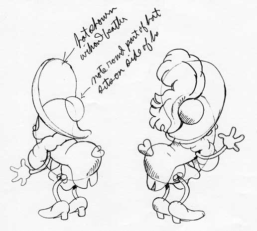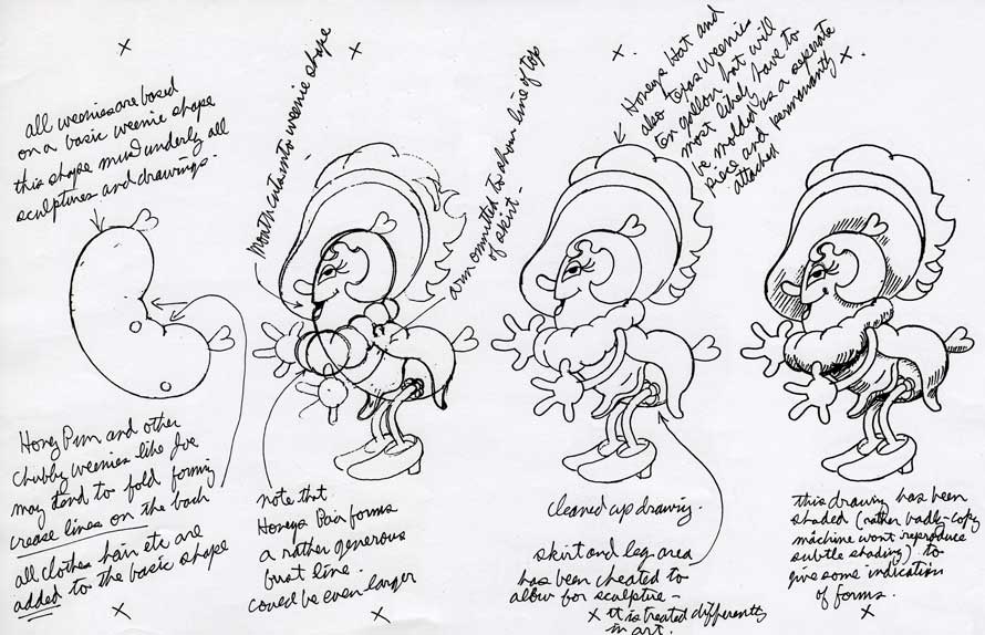 The only figure that I didn’t care for much was Honey Bun. I re-sculpted her face, right then and there, in an attempt to make her prettier. Ironically, a casting of the early version turned out to be the only Honey Bun I was ever able to obtain. A few days after the meeting, I sent drawings to Harvey to see if I could help improve her look. I didn’t feel the need to do that for any of the other figures. These drawings were a curious prevue of things to come. I found myself doing the same thing, extensively, 28 years later, throughout the four years it took the Four Horsemen to sculpt The Outer Space Men.